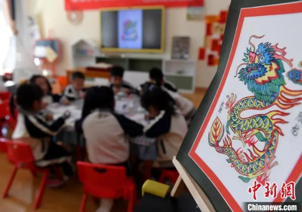 4月16日,孩子们展示自己的年画作品。贾枭梦 摄