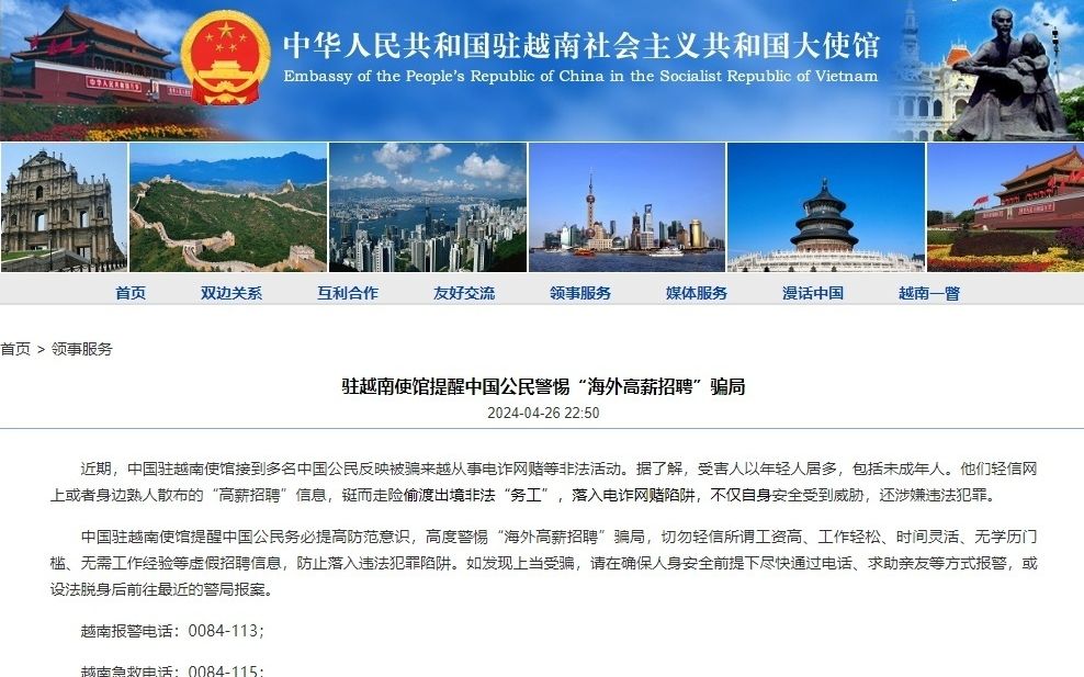 中国驻越南使馆发表声明,提醒中国公民警惕“海外高薪招聘”骗局。
