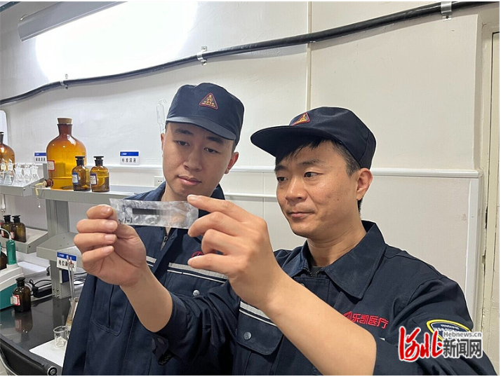 4月28日,张宏伟(右)和同事在车间观测产品感光性能。河北日报记者寇国莹摄