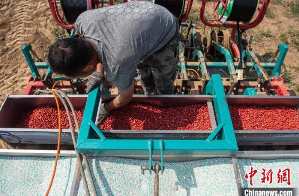 5月8日,在河北省衡水市枣强县一花生种植基地,村民为播种机补充花生种子。连日来,河北省衡水市枣强县的农民抢抓农时播种花生,田间地头呈现出一派繁忙景象。据介绍,枣强县今年预计播种花生面积将达4万亩,年产花生2万吨。