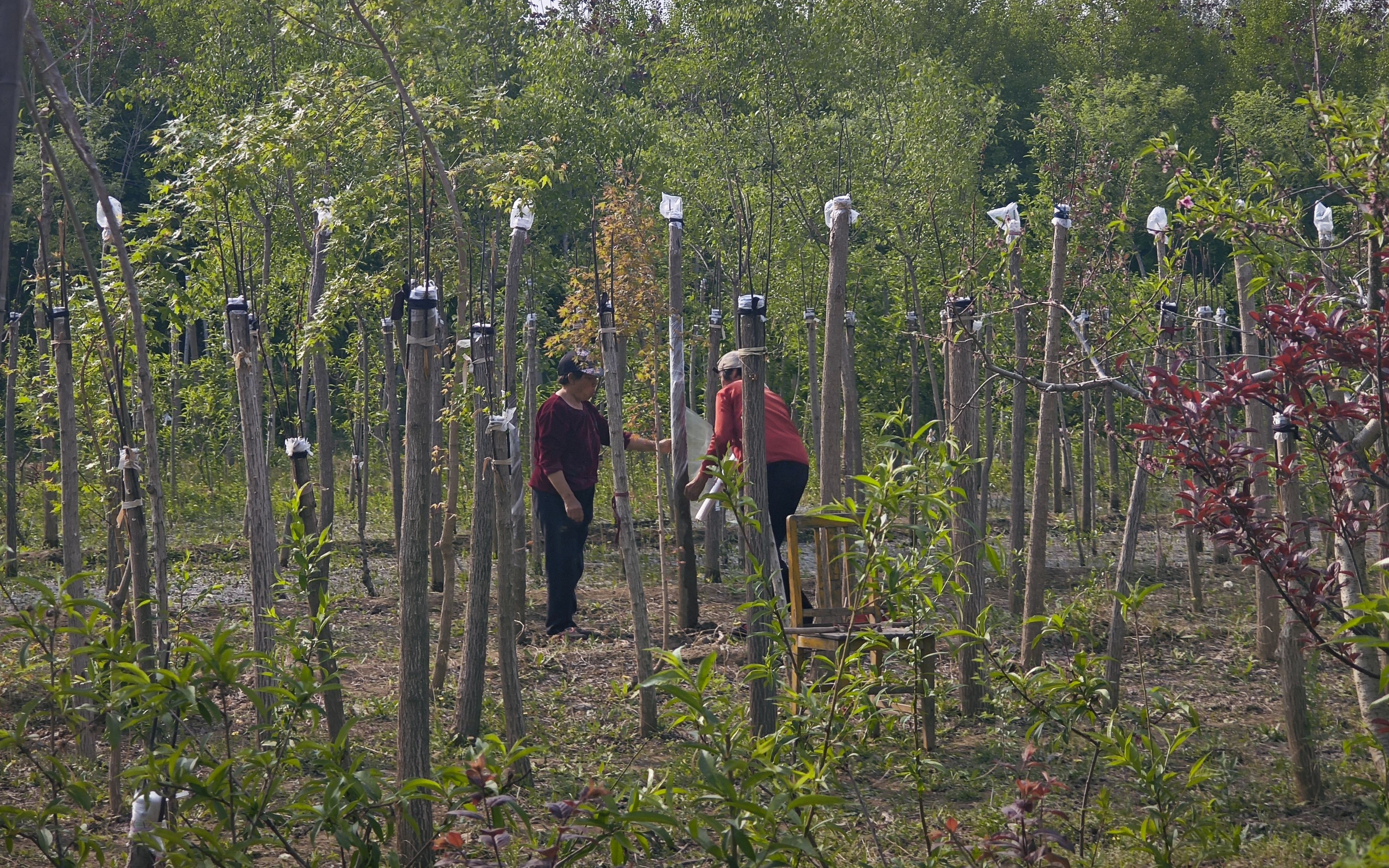 喝完茶后,郎树全带领记者沿着蜿蜒的小径走进农场的深处。沿途,两侧郁郁葱葱的果树映入眼帘。行走至果树种植区,两位农妇正在果树间忙碌,手法娴熟地进行着苹果树的嫁接工作。郎树全介绍道:“她们都是附近的农户,经验丰富,手脚麻利。农场需要大量的劳动力进行种植、养护和采摘,也为周边农户提供了就业机会。”