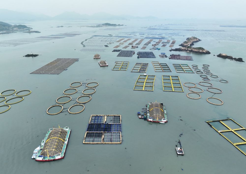 在福建连江定海湾海域,坐落着“闽投1号”“乾动1号”“定海湾1号”等深远海养殖平台。从高空俯瞰,一座座篮球场大小的钢构平台卧于海上,大黄鱼等养殖品在深海“畅游居住”。