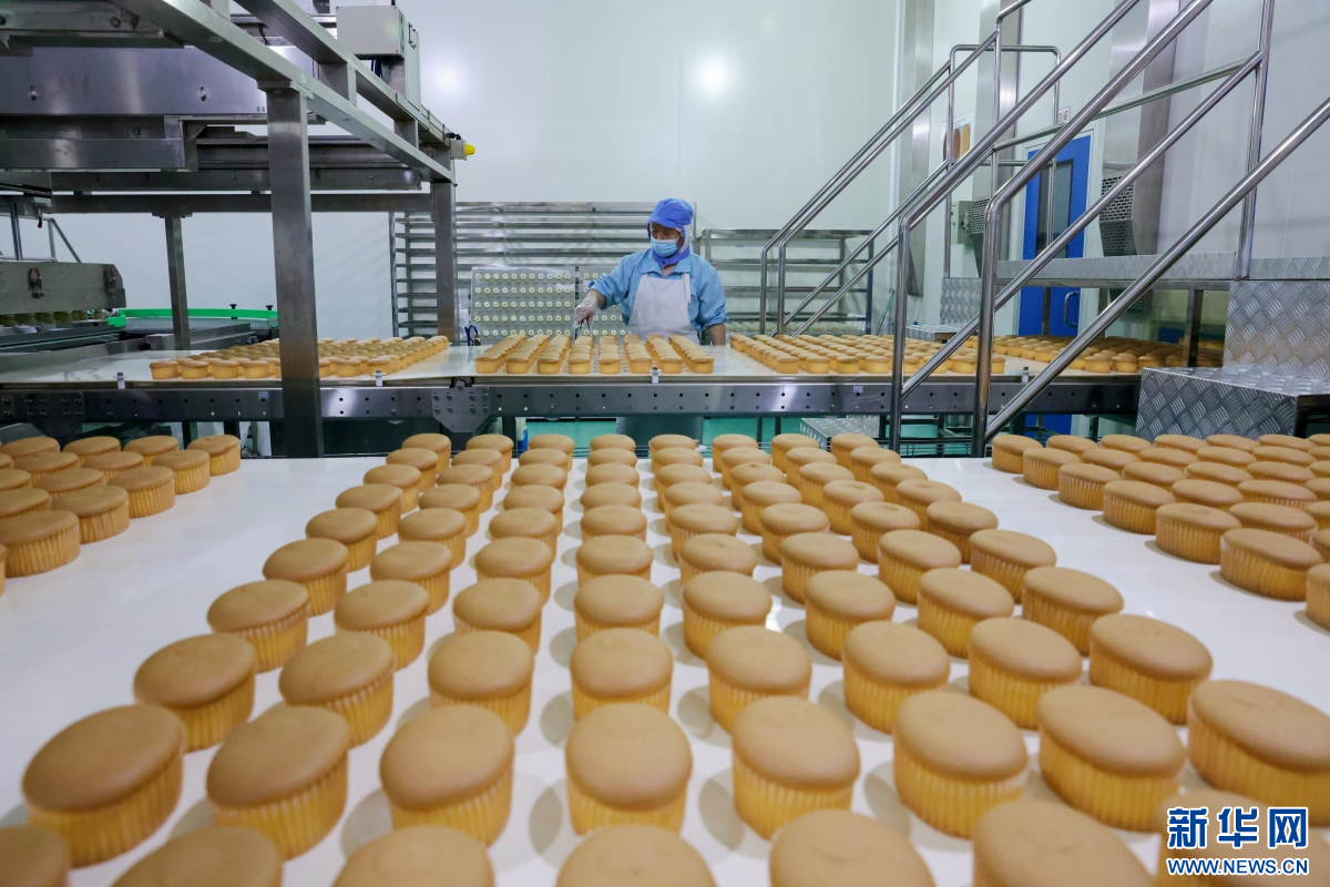 河北马大姐食品有限公司烘焙车间内,工人正在摆放蛋糕。定兴县供图