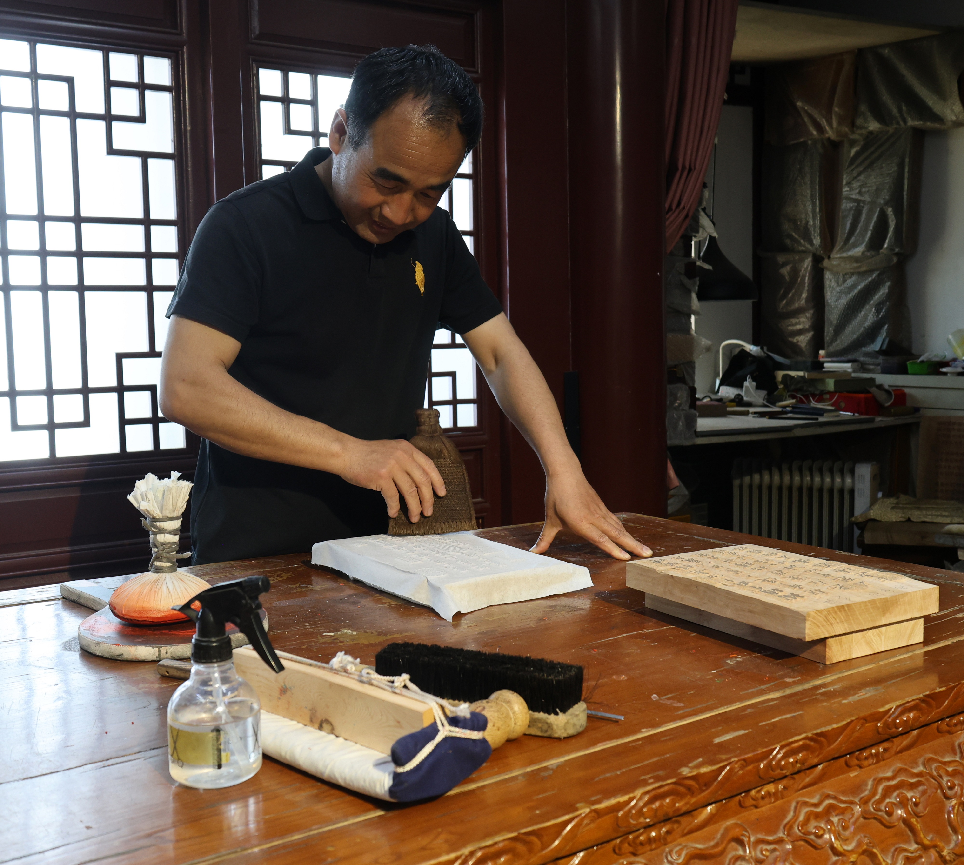 随后,在李新朋的介绍下,记者了解到更多关于法帖的精彩内容。衡水法帖的传承区域主要集中在以衡水市桃城区郑家河沿镇阎庄为中心的周围 70 多个村庄,且阎庄规模最大、最具代表性,故而“衡水法帖”也被称为“阎庄法帖”,阎庄更有“中国木刻法帖第一村”之誉。明朝永乐年间该区域战事水患频发,民不聊生,人们为避战乱奔走他乡,多以贩卖笔墨糊口。阎庄一位阎姓老汉酷爱书法艺术,在贩卖过程中遇碑便拓、见帖就求,为拓展生意萌生了刻版拓帖的想法,自此开始制版售帖且久盛不衰,技艺也在当地代代相传。至清中期,阎庄法帖刻拓已形成完整产业链条。清末民初,阎庄法帖进入北京,据记载,衡水阎庄人阎世竹和阎秉彝师徒在北京琉璃厂设有店铺,分别是清光绪二十年开设的“怡墨堂”和民国十六年开设的“蕴竹斋”。因清末维新思想传播,推动了阎庄法帖扩大生产经营规模,除京津冀外,还远销山西、陕西、内蒙、辽宁等地。