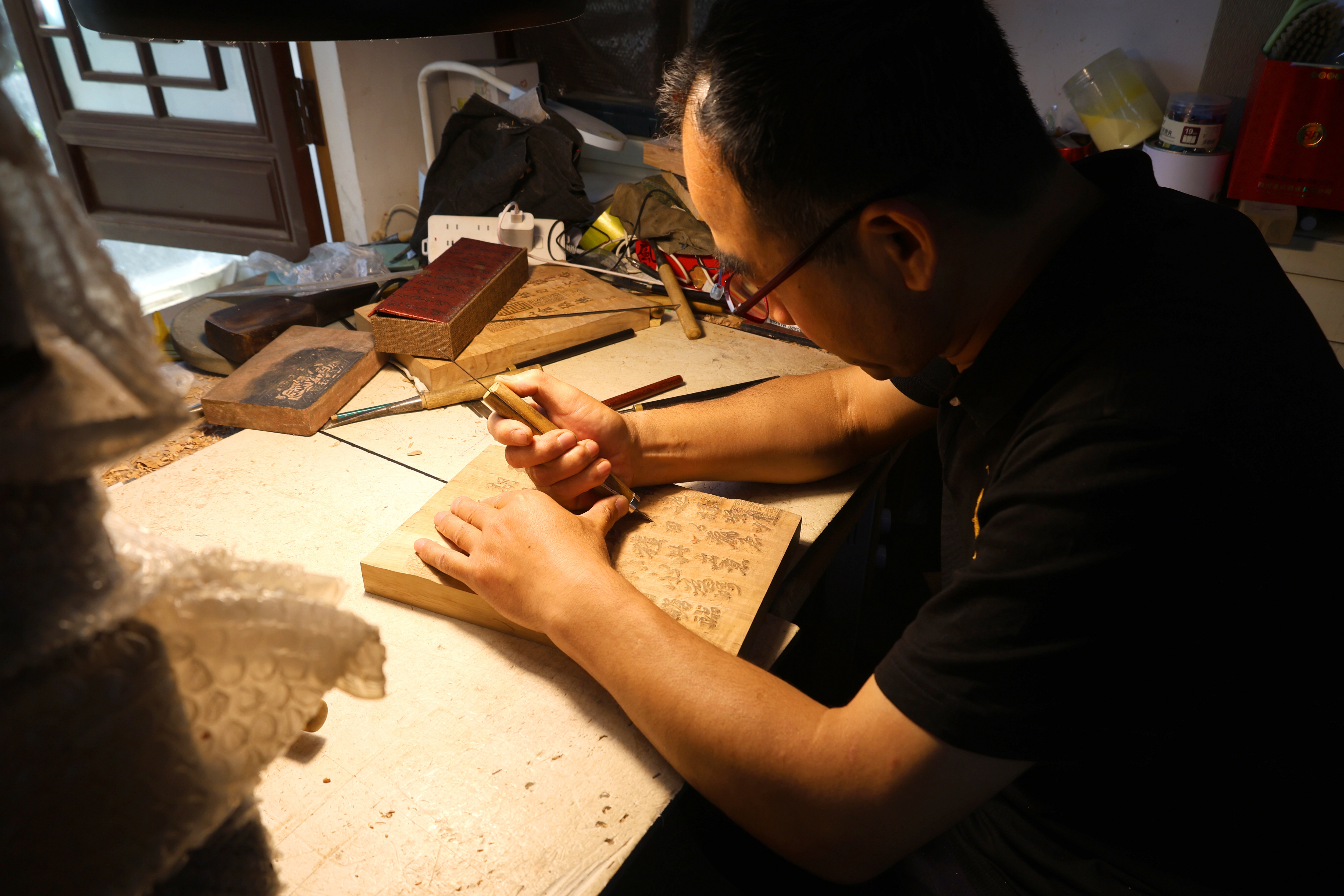 博物馆里,国家级非物质文化遗产衡水法帖雕版拓印技艺省级代表性传承人李广民,正全神贯注地进行刻版。他以刀为笔,每一刀都精准无比,每一笔都充满了力量与韵律。