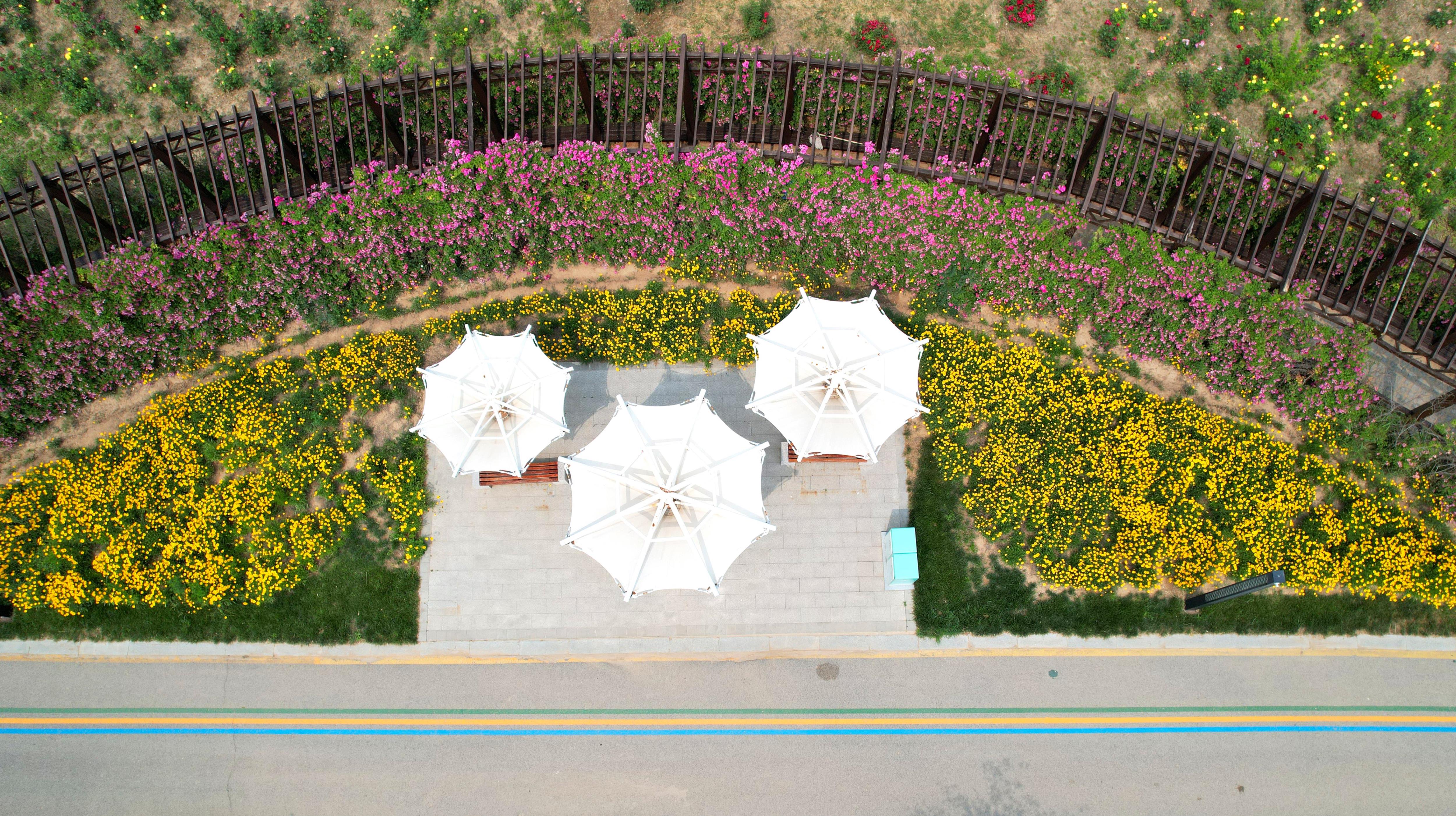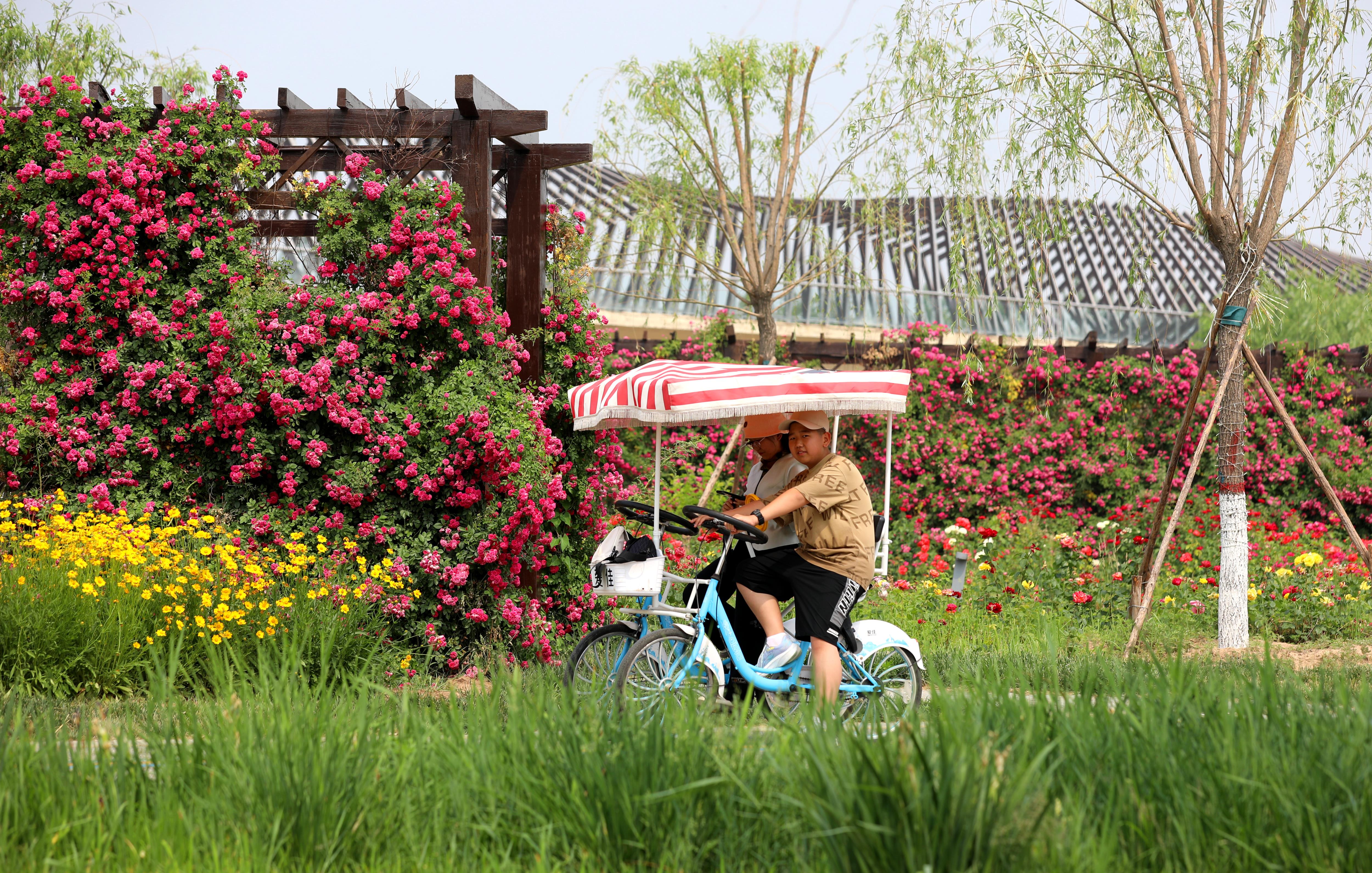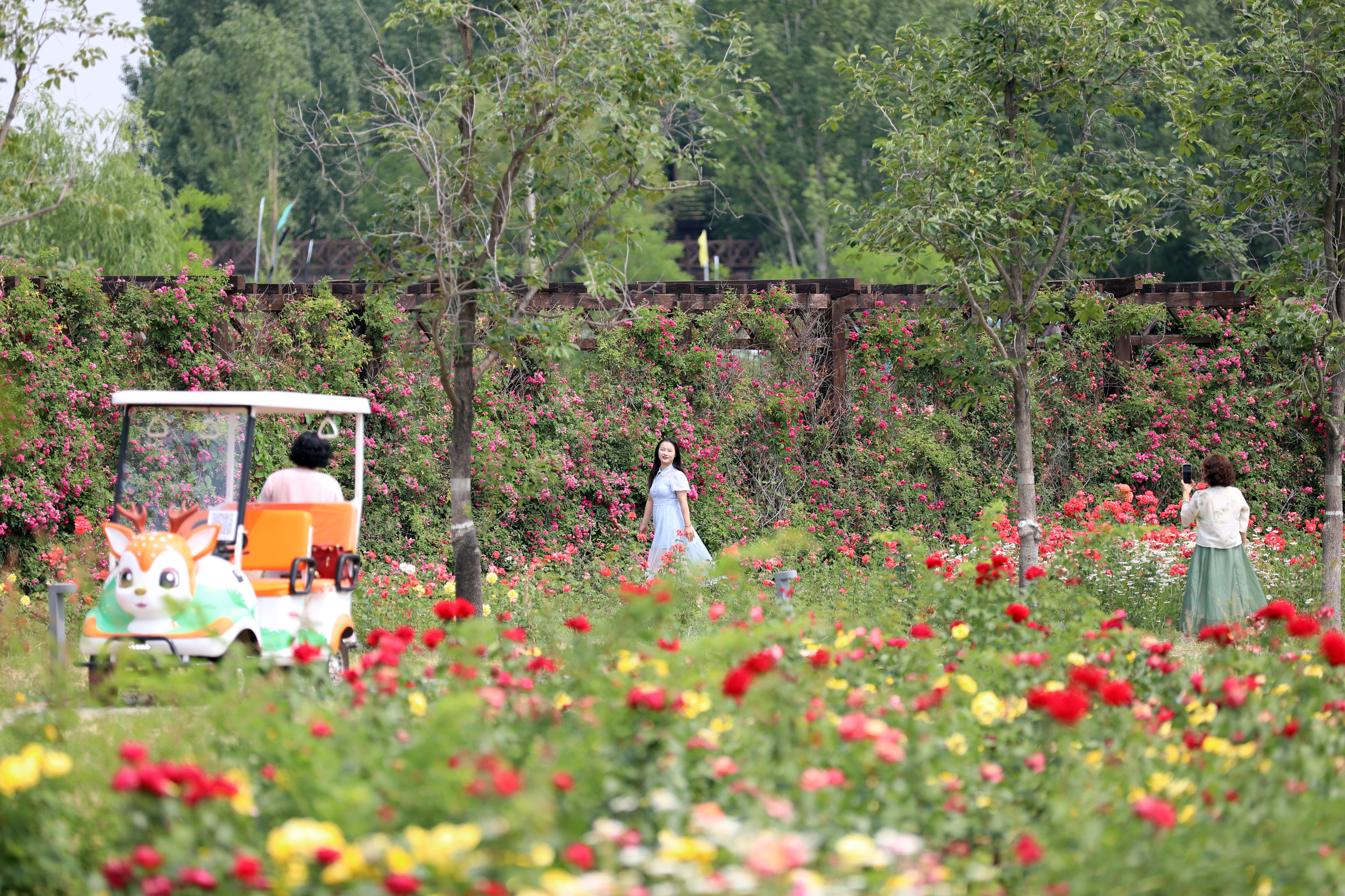 一路前行,来到蔷薇花廊处,微风拂过,花海像波浪一般涌动,沁人心脾的花香,层层叠叠花海让人如痴如醉。来自石家庄的陈先生和爱人计划自驾游到海边,途径此地,他说,在这里看到非常多的鸟类,空气清新,四处飘香,环境好,一侧是波光粼粼的湖水,一侧是树木葱茏及各色的花海,这样的景色,让人流连忘返。