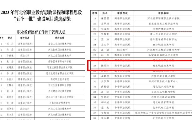 近日,河北省教育厅发布了《河北省教育厅关于公布2023年职业教育思政课程和课程思政“五个一批”建设项目遴选结果的通知》(冀教职成函〔2024〕21号),衡水职业技术学院荣获“职业教育课程思政优秀教学案例”和“职业教育德育工作骨干管理人员”各一项。