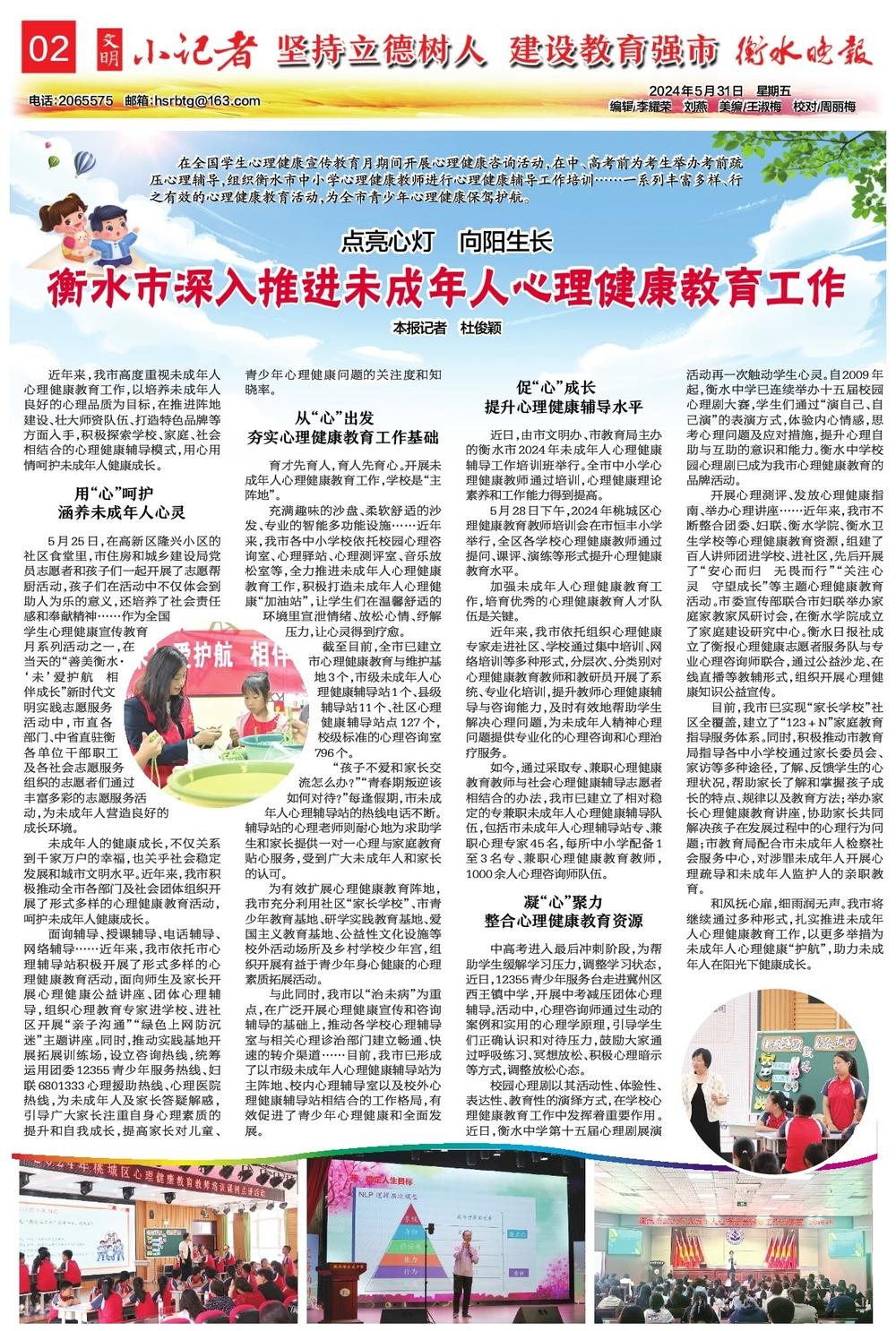 近日,由市文明办、市教育局主办的衡水市2024年未成年人心理健康辅导工作培训班举行。全市中小学心理健康教师通过培训,心理健康理论素养和工作能力得到提高。