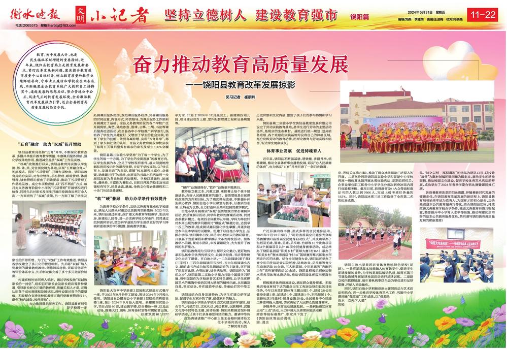 饶阳县教育局坚持“五育”并举,不断深化教育改革,多措并举提升教育教学质量,丰富课后服务供给,强化学校阵地作用,推进减负提质“双减”工作见实效。