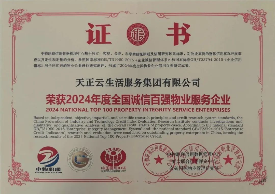日前,由中国职业经理人协会物业经理人分会发起的第五届全国520物业人节交流联谊会暨“增强安全意识,提高防范能力”主题论坛在北京圆满举办。活动现场公布了2024年度全国物业服务企业信用数据测评诚信百强企业名单,天正云生活服务集团荣获“2024年度全国诚信百强物业服务企业”称号。
