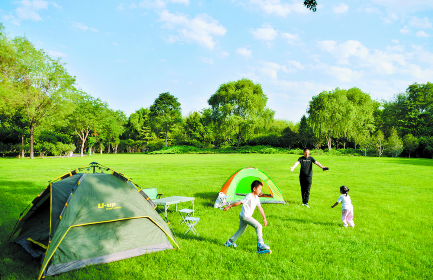 6月3日,在石津灌渠文化公园,小朋友和家长在草坪上一起搭建好帐篷后,快乐玩耍。 记者 张晓峰 摄