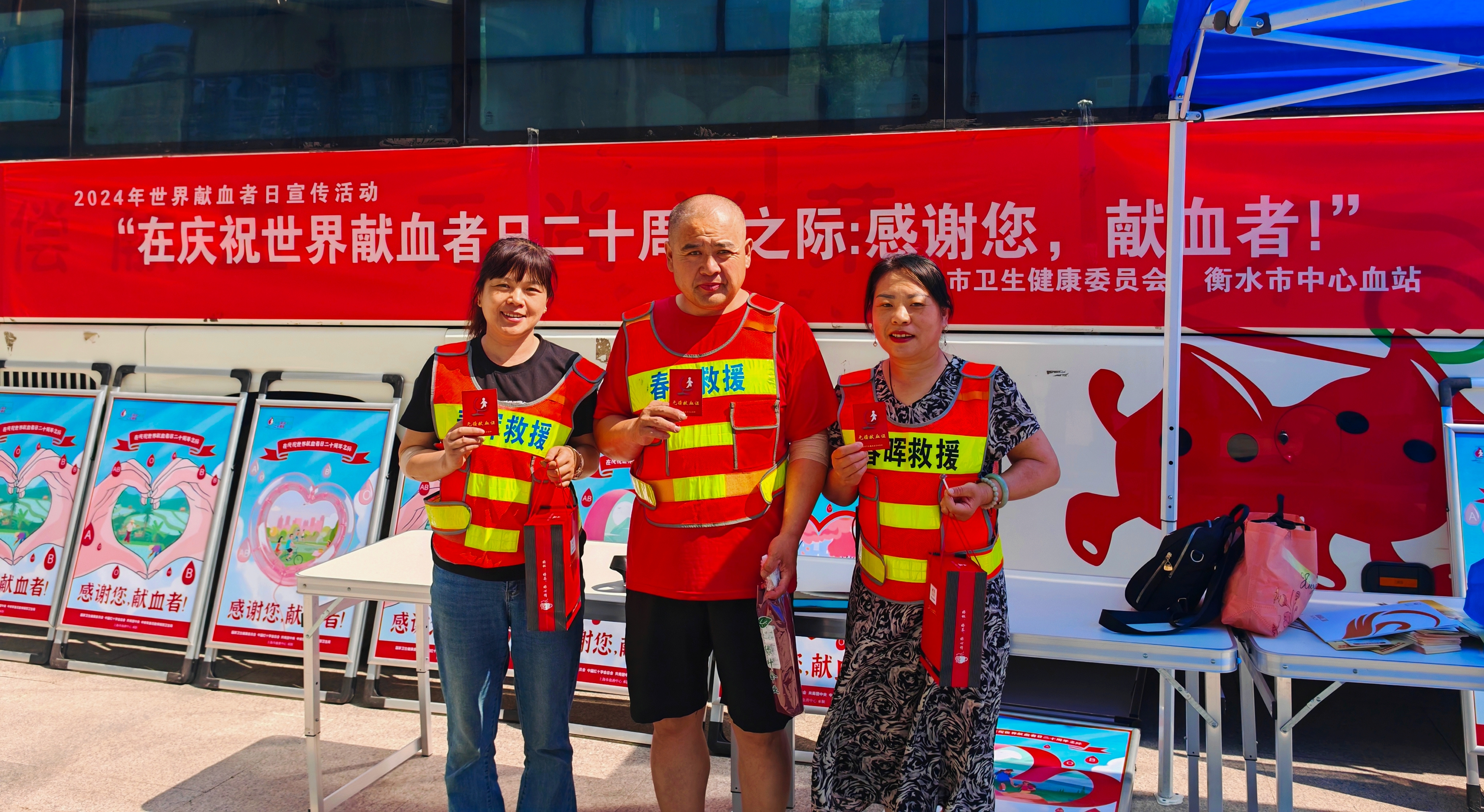 6 月 14 日,正值世界献血者日,为大力宣传和弘扬无偿献血的无私奉献精神,衡水市春晖义工协会与衡水卫生健康委员会携手,在市区万达广场组织志愿者开展了“汇聚青春正能量,无偿献血传爱心”的无偿献血主题活动。