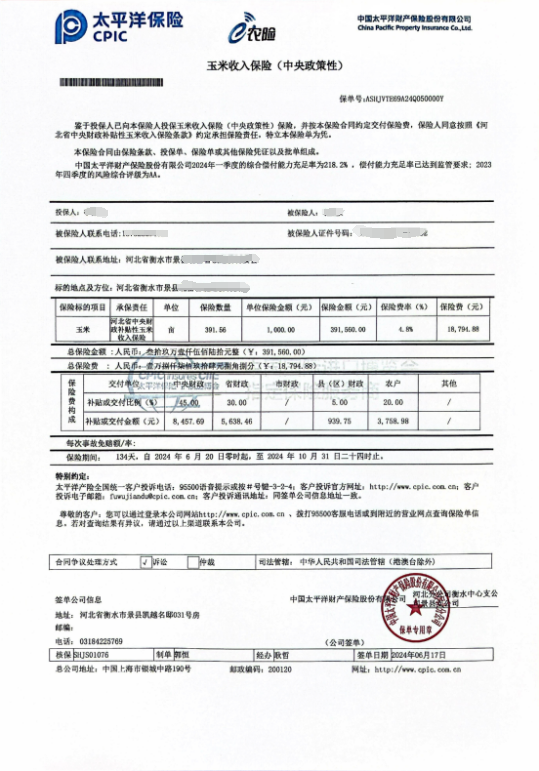 6月17日,中国太保产险衡水中支完成了种植大户李某政策性玉米收入保险出单工作,该保单为全市首单政策性玉米收入保险。