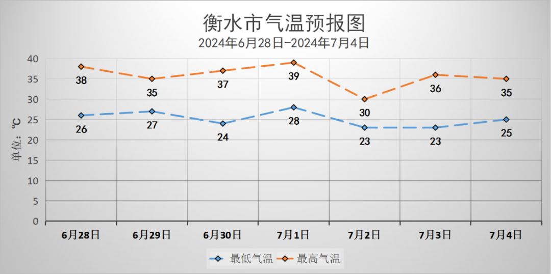 具体天气预报为:6月28日,晴转多云,夜间南部和东部县市有阵雨或雷阵雨,气温:38到26℃;6月29日,阴,南部县市有阵雨或雷阵雨,气温:35到27℃;6月30日,多云间阴,气温:37到24℃;7月1日,阴有阵雨或雷阵雨,气温:39到28℃;7月2日,阴,气温:30到23℃;7月3日,阴有阵雨或雷阵雨,气温:36到23℃;7月4日,阴有阵雨或雷阵雨,气温:35到25℃。