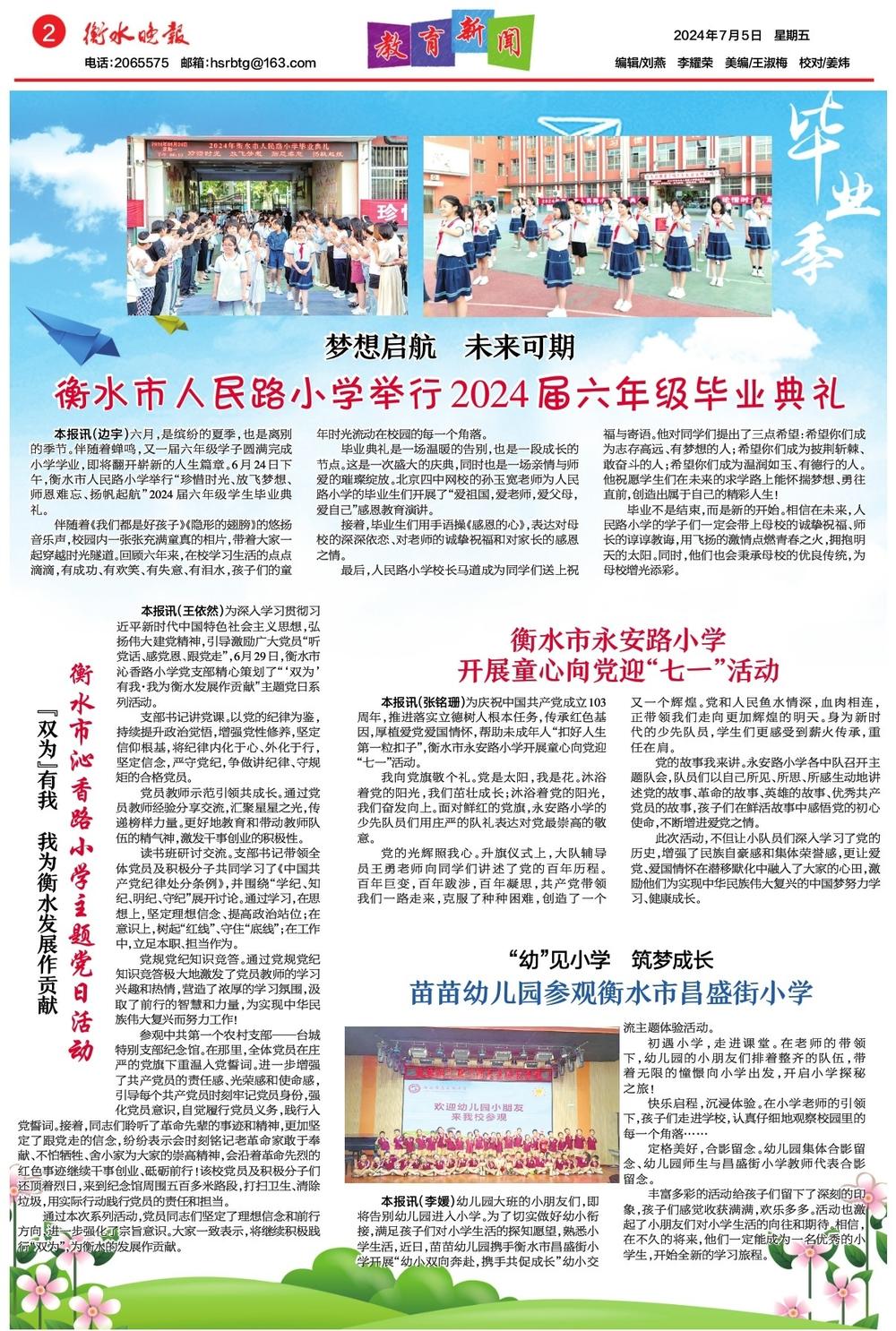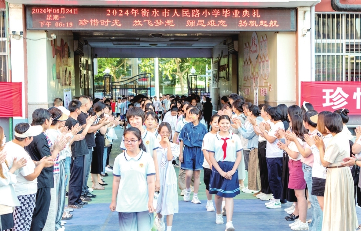 本报讯(边宇)六月,是缤纷的夏季,也是离别的季节。伴随着蝉鸣,又一届六年级学子圆满完成小学学业,即将翻开崭新的人生篇章。6月24日下午,衡水市人民路小学举行“珍惜时光、放飞梦想、师恩难忘、扬帆起航”2024届六年级学生毕业典礼。