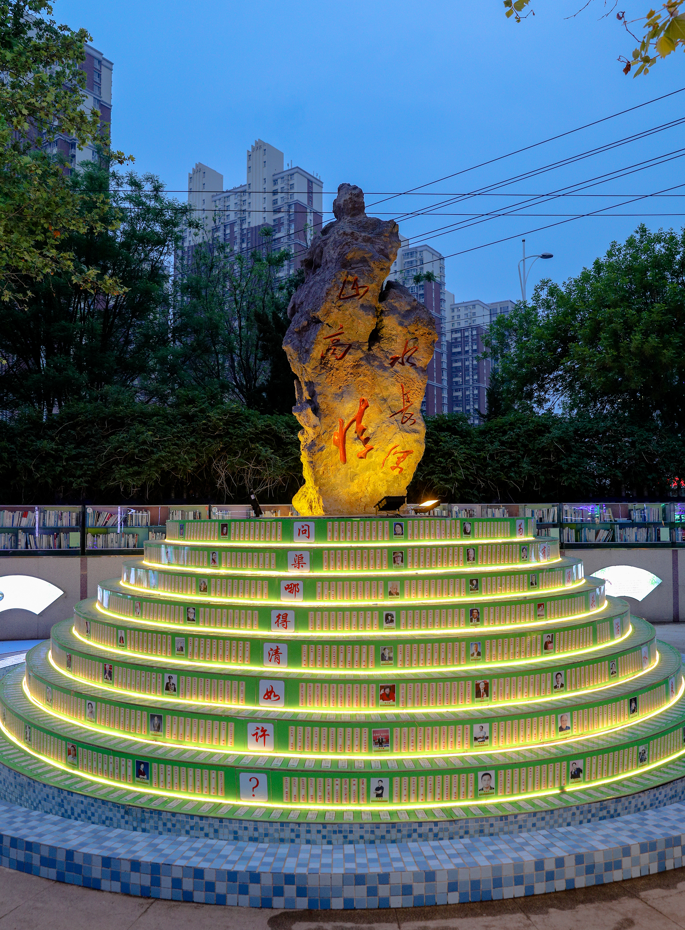 “情深石”代表十三中教师爱生如子,十三中学子对母校情深,石下的博雅书阶立面呈现的是古今中外名著,内容涉及文学艺术、天文地理、政治法律等共计2000余部,同时穿插了名人图像;台阶的水平面为对青年学子有励志意义的中外名言,共计2000余条。