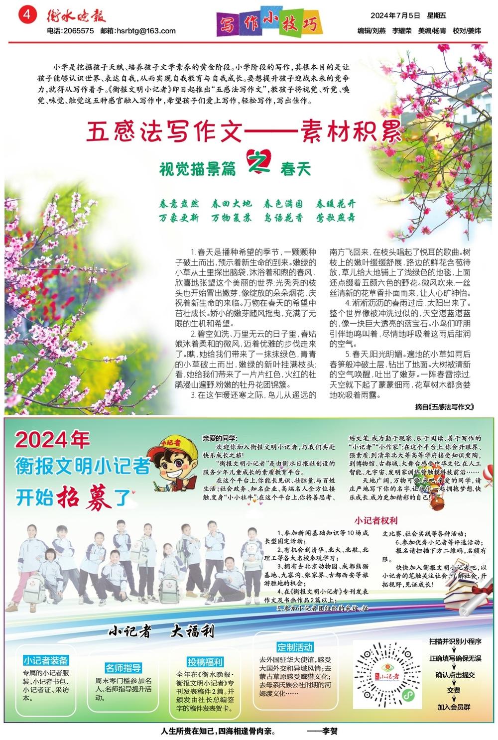 小学是挖掘孩子天赋、培养孩子文学素养的黄金阶段。小学阶段的写作,其根本目的是让孩子能够认识世界、表达自我,从而实现自我教育与自我成长。要想提升孩子迎战未来的竞争力,就得从写作着手。《衡报文明小记者》即日起推出“五感法写作文”,教孩子将视觉、听觉、嗅觉、味觉、触觉这五种感官融入写作中,希望孩子们爱上写作,轻松写作,写出佳作。