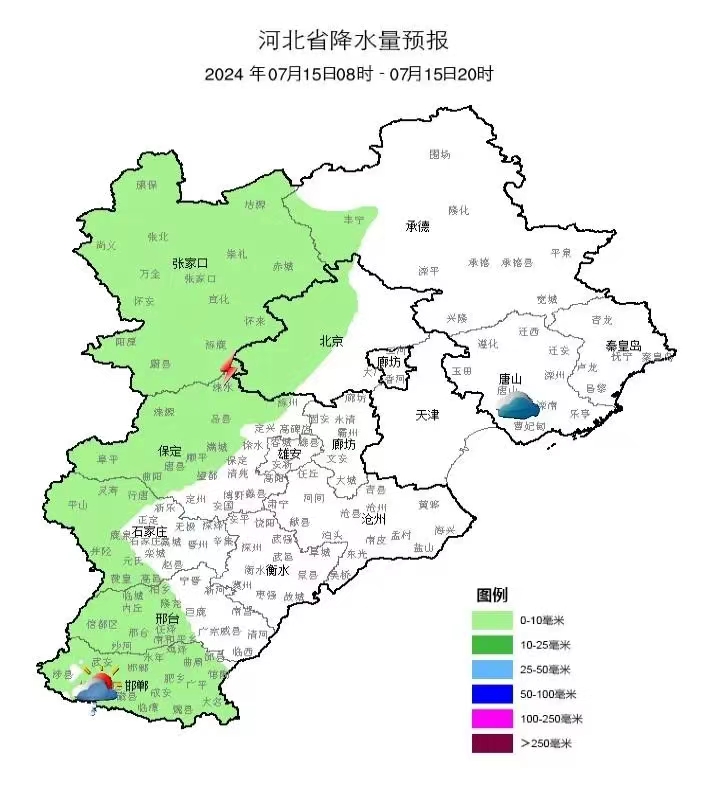 具体天气预报为:7月15日,多云转阴,夜间有雷阵雨或阵雨,偏南风2~3级,气温32~22℃;7月16日,阴有小雨转多云,气温34~25℃;7月17日,多云间晴,气温34~25℃;7月18日,多云,气温35~25℃;7月19日,多云转阴有雷阵雨或阵雨,气温35~25℃;7月20日,多云,气温33~26℃。