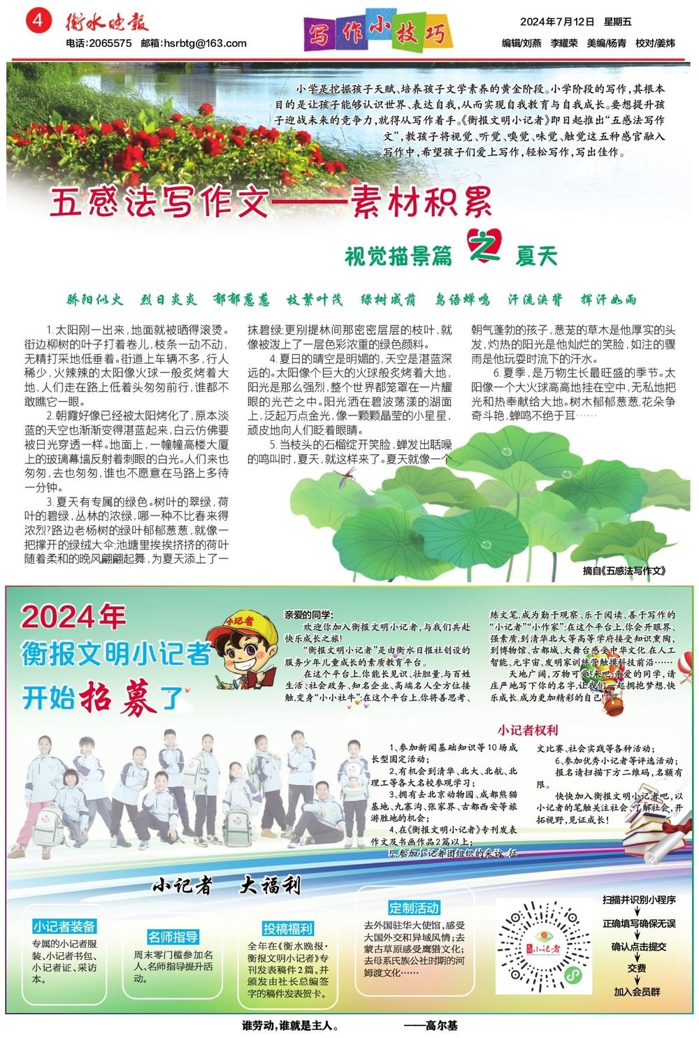 小学是挖掘孩子天赋、培养孩子文学素养的黄金阶段。小学阶段的写作,其根本目的是让孩子能够认识世界、表达自我,从而实现自我教育与自我成长。要想提升孩子迎战未来的竞争力,就得从写作着手。《衡报文明小记者》即日起推出“五感法写作文”,教孩子将视觉、听觉、嗅觉、味觉、触觉这五种感官融入写作中,希望孩子们爱上写作,轻松写作,写出佳作。