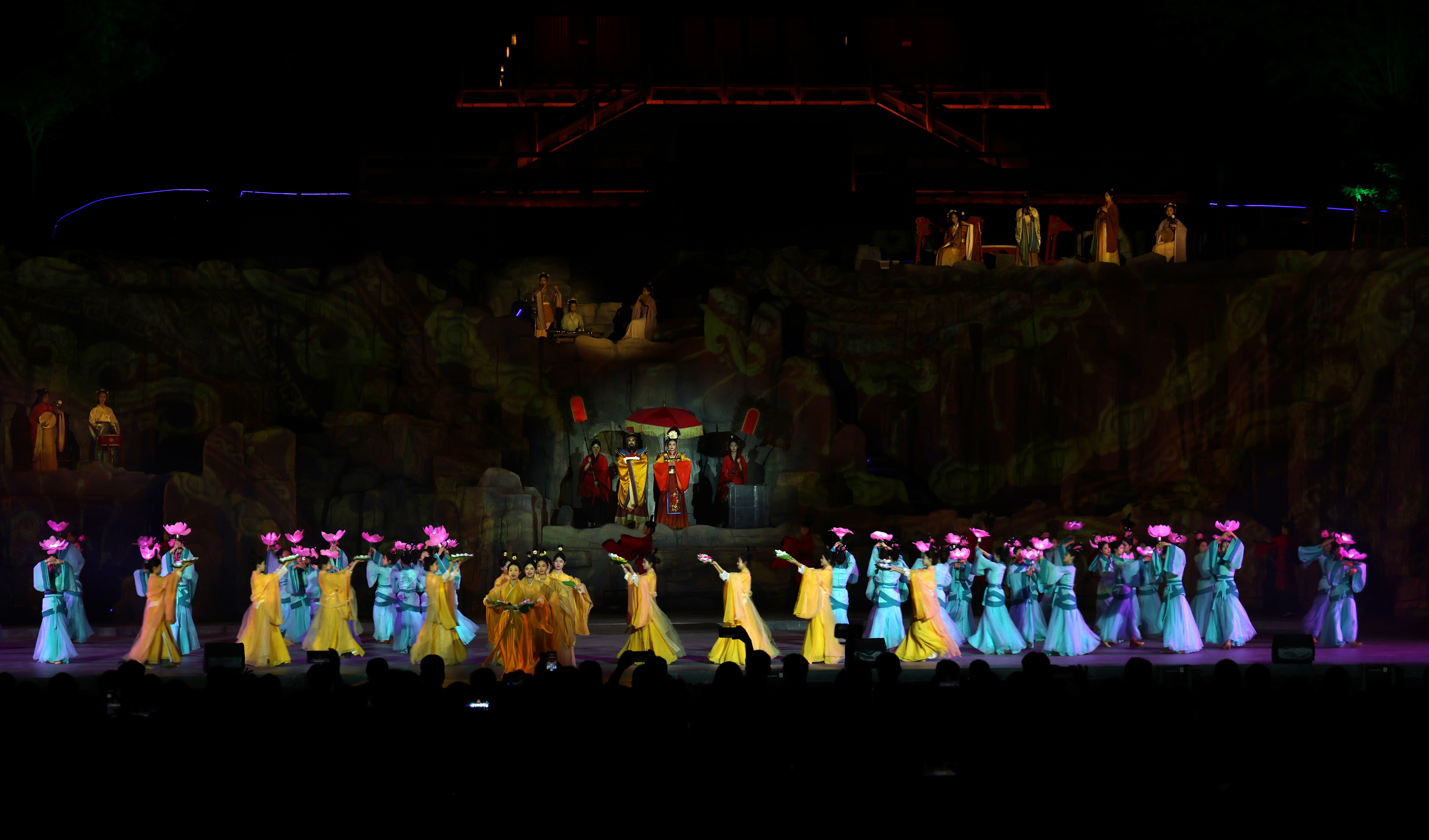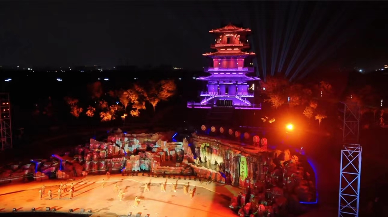 “一方古碑镌刻岁月风华,一次巡游昭示皇权天下,那是衡水之滨的煌煌禊礼,那是衡水之名的溯源寻根……”实景演出中,伴随着智者铿锵有力的独白,“文成帝南巡碑”出现,“衡水”二字破碑而出,呈现在观众面前。低沉的大角声中,吹奏乐器、弦乐与打击乐器合奏,北魏文成帝和文明皇后(冯太后)缓缓入场。