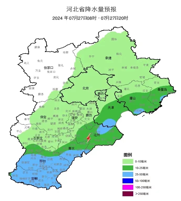 衡水市气象台7月26日12时发布重要气象专报,受台风“格美”减弱低压影响,预计27日开始,我市将有一次强降雨过程,累积降雨量80~150毫米,部分乡镇可达250毫米以上。最强降雨时段在28日,最大雨强为40~70毫米/小时。