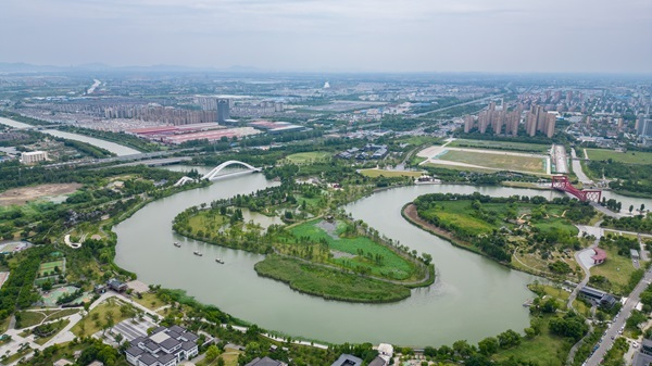 运河三湾生态文化公园鸟瞰图(央广网记者 郑楚豫 摄)