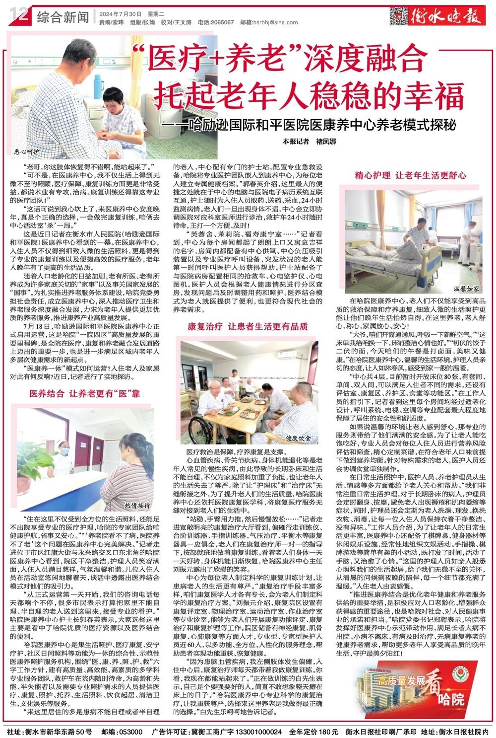 在衡水市人民医院(哈励逊国际和平医院)医康养中心,入住人员不仅得到细致入微的生活照料,更是得到了专业的康复训练以及便捷高效的医疗服务,老年人晚年有了更高的生活品质。