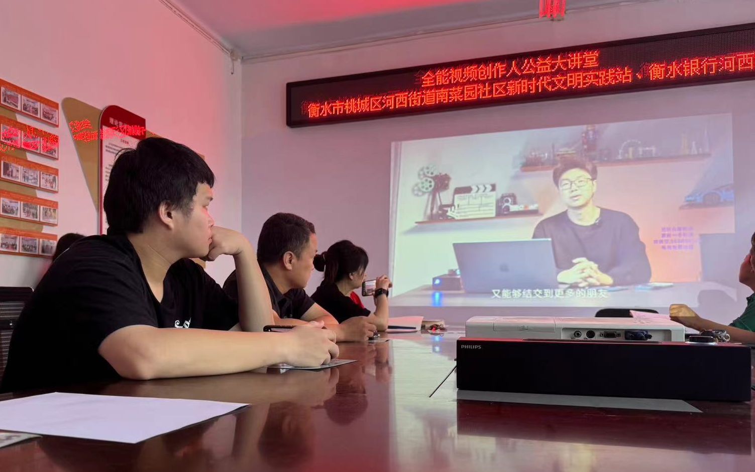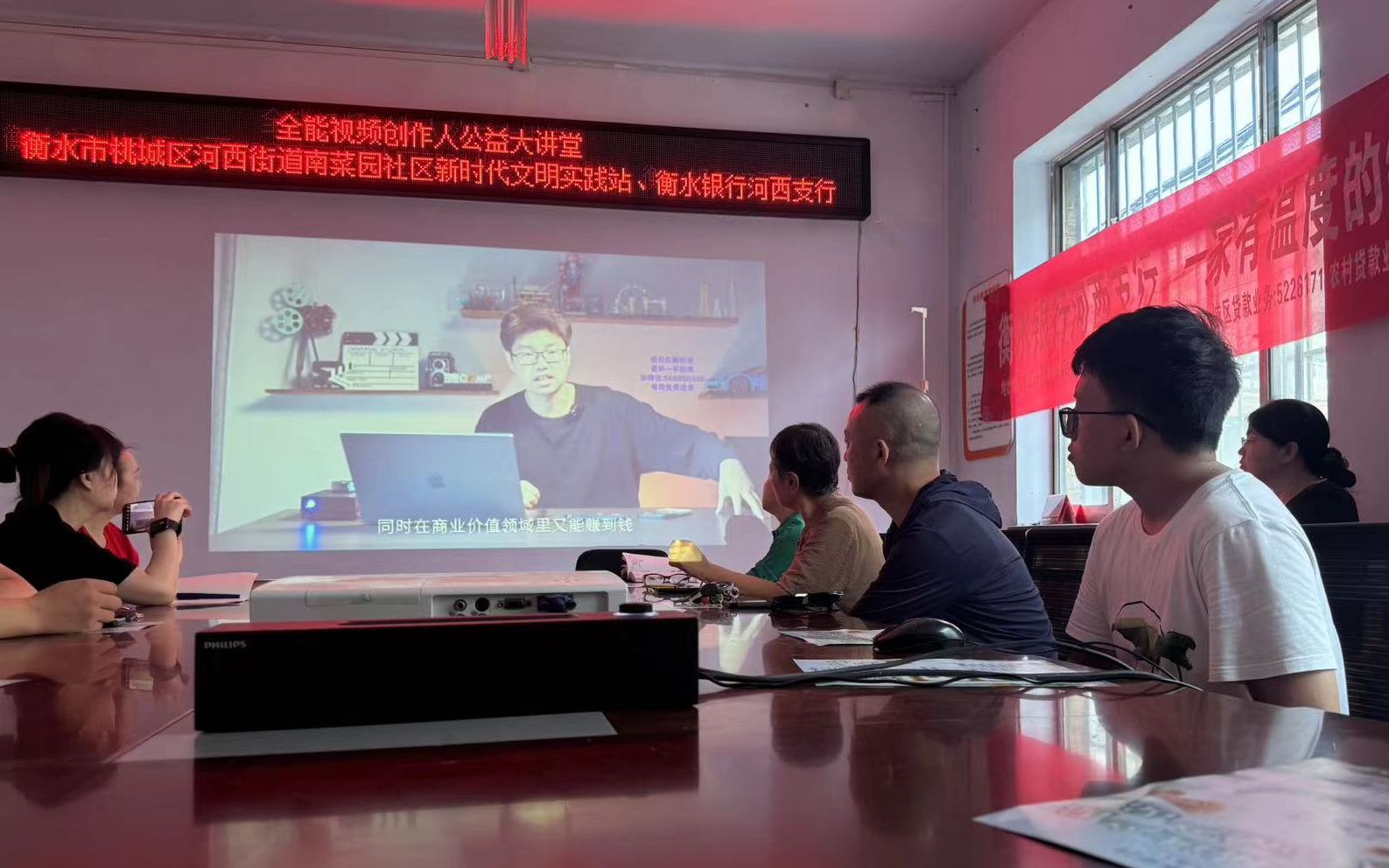此次的公益课为开营第一期,吸引了周边商户、社区居民和视频创作爱好者的广泛参与。课堂上,通过播放“全能视频创作人”视频课为参与者送上了精彩的视频制作课程,在现场,参与者们不仅学习到了实用的技术知识,还进行了实践操作,体验了从构思到成品的全过程。在接下来的三个月时间里,每周四上午8点30分到9点30分,衡水银行河西支行、南菜园社区将持续为广大视频爱好者送上一系列有关拍摄、剪辑、编导、运营等的精彩视频制作课程。