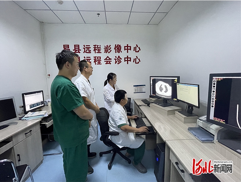 8月6日,易县远程影像中心专家们为乡镇卫生院拍摄的CT做诊断。易县医院供图