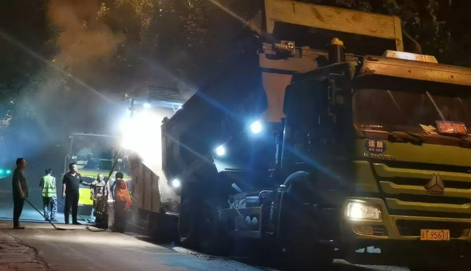 在市区利华建材市场附近,路面铣刨、清扫、喷油、摊铺、压实,作业场面热火朝天、忙碌有序,施工人员采取人工与机械设备相互配合、协同作业的工作模式,加速推进施工进度。热气滚滚的沥青油料从运料车上倾泻而下,热气还未散尽,摊铺机便开始均匀地摊铺沥青路面,一旁的摊铺工人平整沥青,经过压路机多次碾轧后,整个路面变得平整结实。