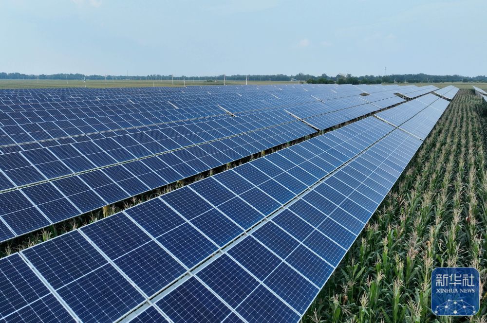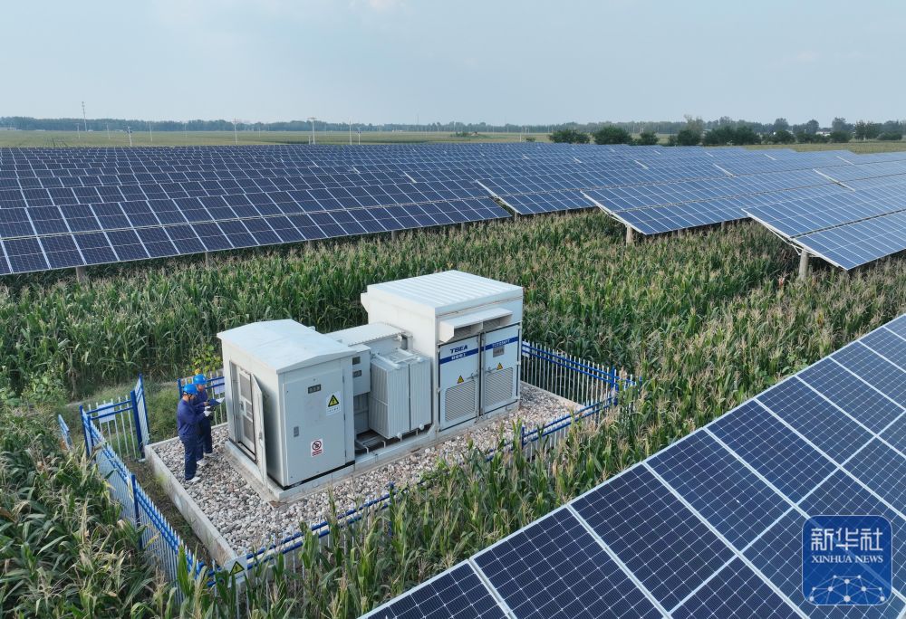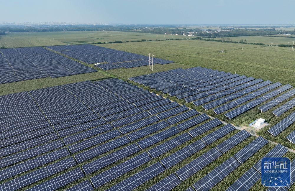↑8月21日拍摄的河北省衡水市冀州区冀州镇附近的“农光互补”光伏发电场(无人机照片)。