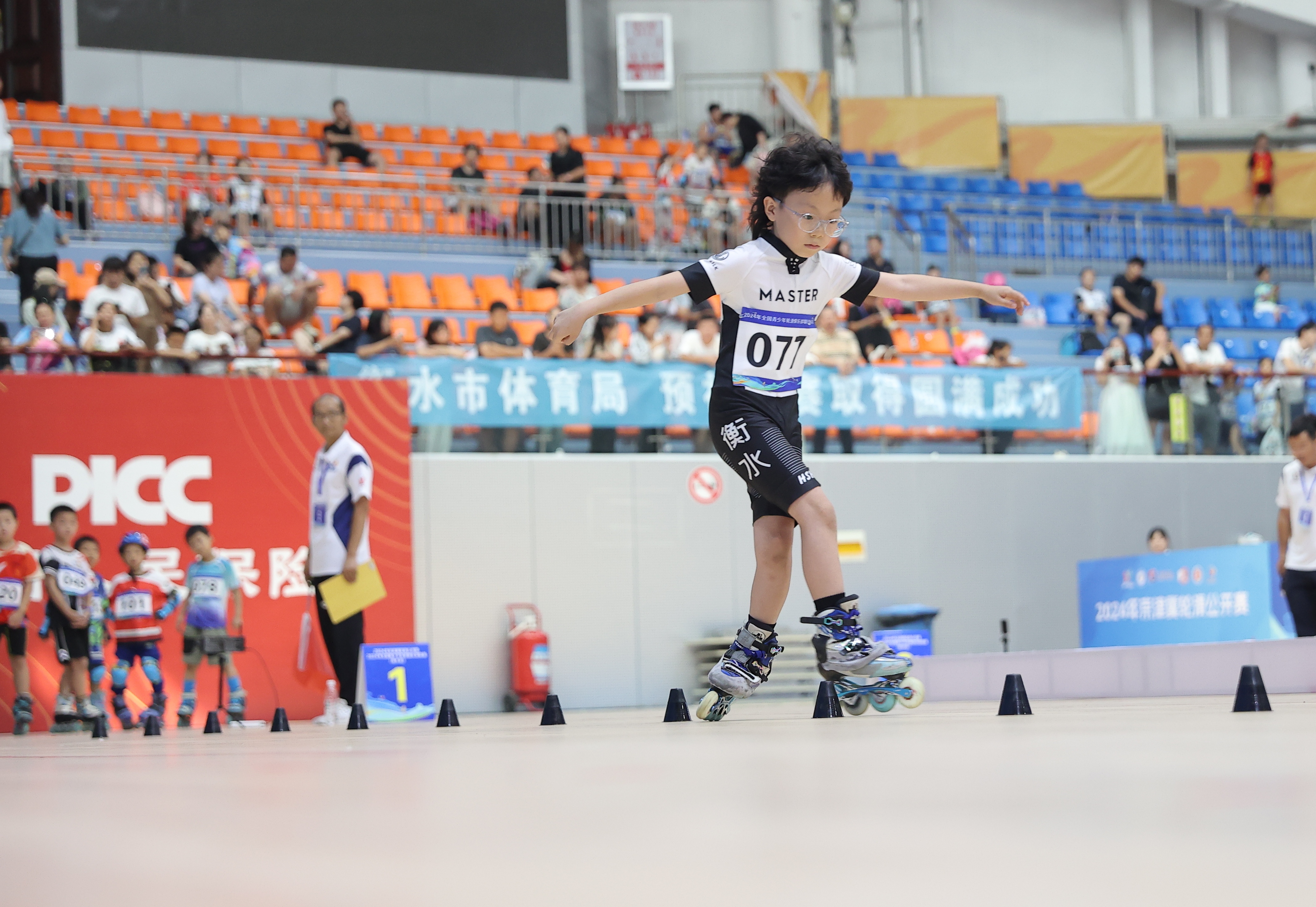 比赛分青年组、少年甲组、少年乙组、少年丙组、少年丁组、儿童组、公开组共7个组别,设置速度轮滑和自由式轮滑两个项目。其中,速度轮滑设置200米计时赛、500米+D争先赛、1000米争先赛等比赛项目;自由式轮滑设置速度过桩、花式绕桩、Fish绕桩竞速、Cross绕桩竞速、单排花式绕桩等比赛项目。赛场上,轮滑小将们凭借着娴熟的技术像风一样在赛道上滑行,一声声的加油呐喊,一次次的侧身绕桩,一步步的奋力冲刺,点燃了整个赛场!