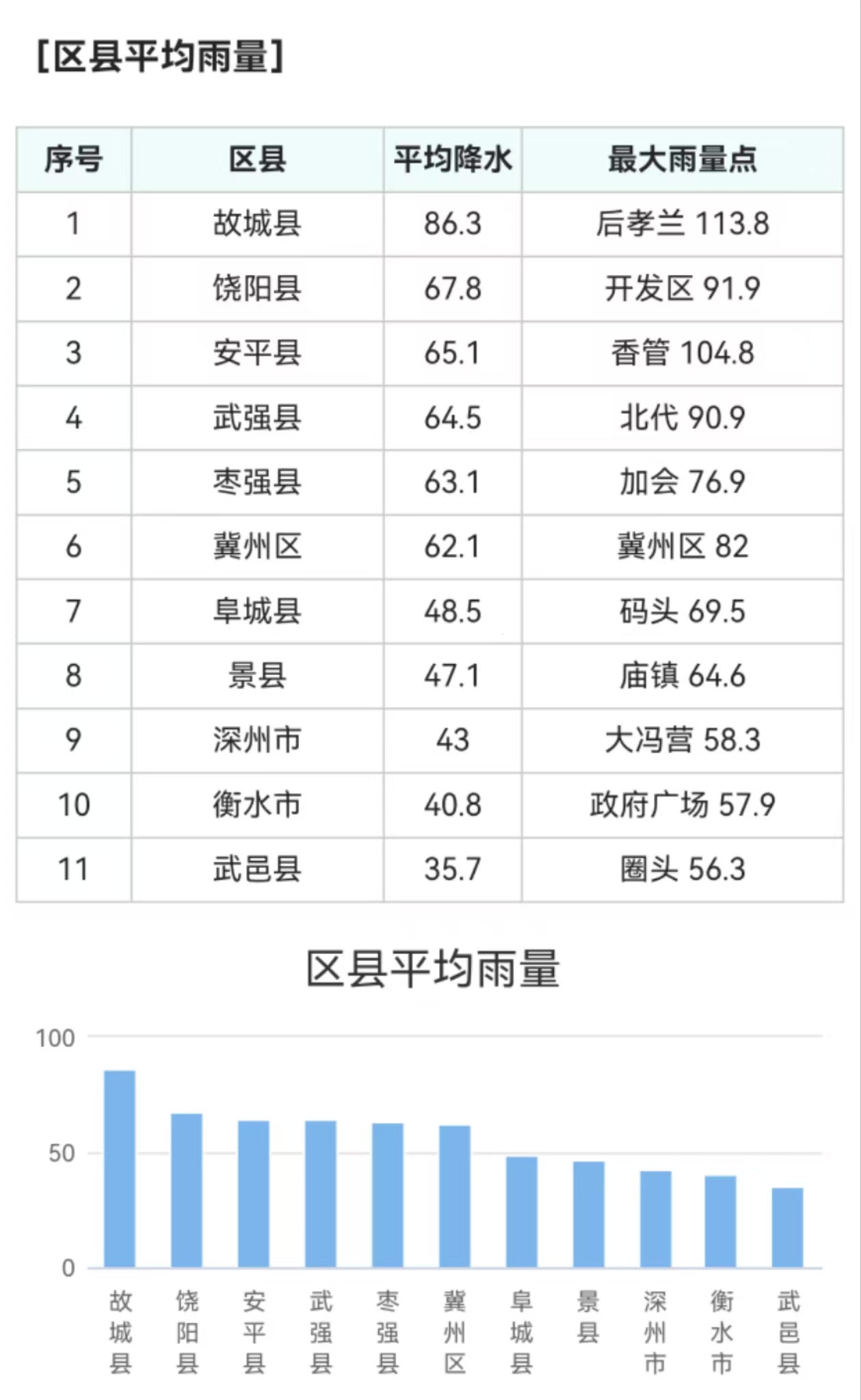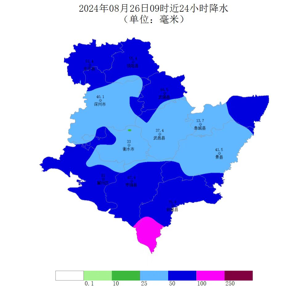 截至26日9时,衡水市平均雨量55.4毫米,区县平均雨量最大为故城县86.3毫米,单站最大为故城县建国和故城县后孝兰113.8毫米,其次为故城县西半屯112.3毫米。149个气象站,其中148个出现了降雨(大于0.1毫米),大于100毫米的有6个站,50—100毫米的有79个站,25—50毫米的有57个站。市区平均降雨量40.8毫米,最大为人民广场 57.9毫米。