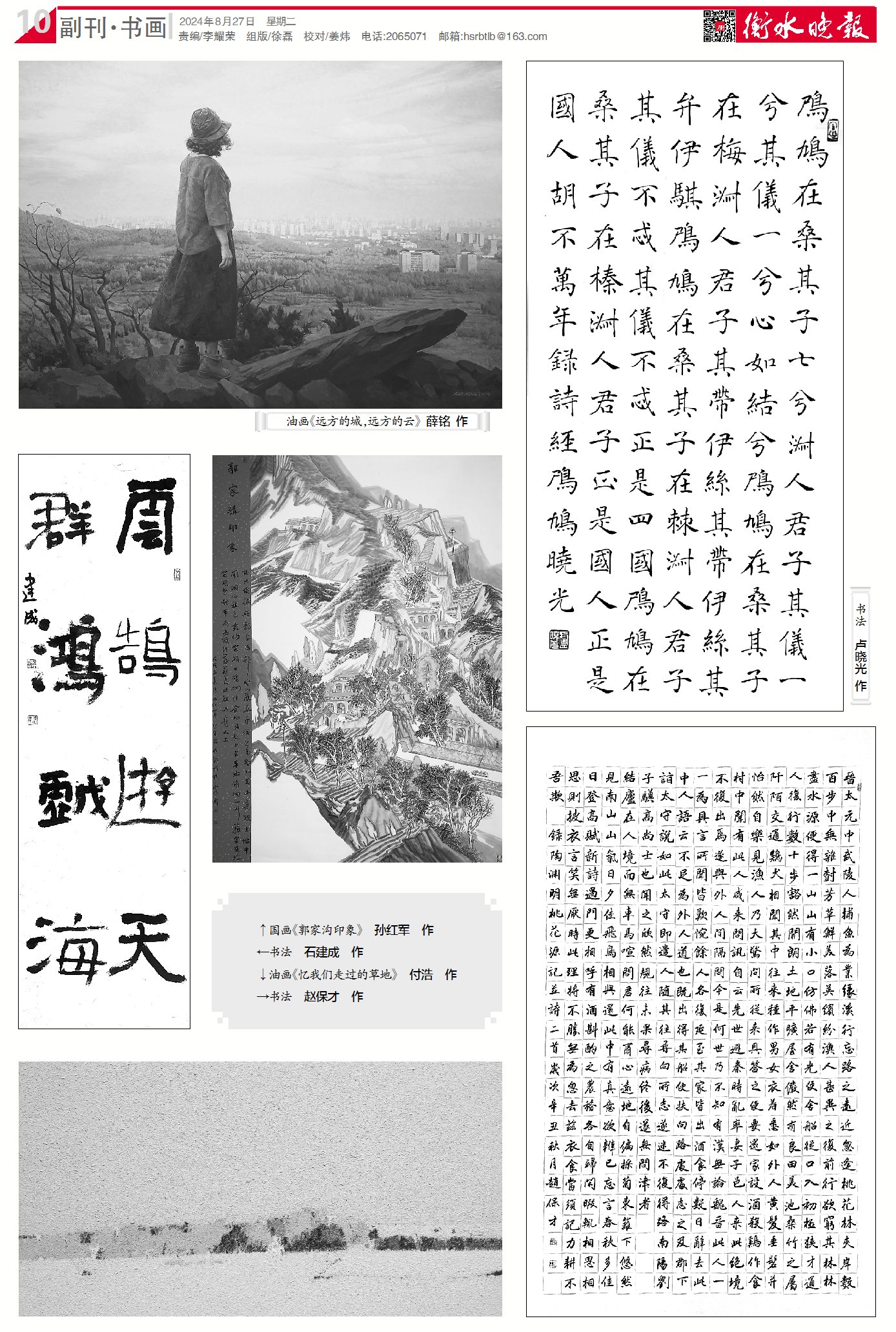 油画《远方的城,远方的云》 薛铭 作书法 石建成 作国画《郭家沟印象》 孙红军 作油画《忆我们走过的草地》 付浩 作书法 卢晓光 作书法 赵保才 作 点赞 +1 微博 微信 我要评论 发布 相关推荐 看图学习·冰雪春天丨建设健康中国 总书记指明冰雪运动发展方向 要闻 4小时前 时政微观察丨开好局起好步,总书记这样要求“关键少数” 时政 4小时前 习近平致电祝贺苏林当选越共中央总书记 时政 8小时前 近闻·开局之年“第一课”,总书记为接续奋斗划重点 要闻 10小时前 【回眸2025】天更蓝 水更清 地更净——2025年衡水市持续发力绘就生态发展新画卷 衡水速览 15小时前 衡水百余件内画精品亮相福建三明 衡水速览 15小时前 习近平总书记关切事|好家风薪火传 要闻 16小时前 微视频|领会把握“十五五”战略部署 总书记强调三个关键词 要闻 1天前 热门 一天 三天 一周 1 【回眸2025】天更蓝 水更清 地更净——2025年衡水市持续发力绘就生态发展新画卷 2 衡水百余件内画精品亮相福建三明 3 “十四五”期间 衡水3281个村庄完成农村生活污水治理 4 衡水早餐“微市场”:寒冬里的人间烟火 5 【2026奔跑向未来】衡水阜城:“南果北种”结出致富果 6 “粥”到情暖 爱满寒冬 武邑开展腊八节关怀活动 7 时习之丨一体推进不敢腐、不能腐、不想腐 8 为家乡代言 为学校争光 安平四小学子亮相《童声878》 9 金融观察|人保财险一分公司涉四项违规被罚近百万元,内部合规管理急待加强 10 近闻·开局之年“第一课”,总书记为接续奋斗划重点 1 衡水湖:越冬鹤群踏冰栖息 大寒时节绘就生态画卷 2 衡水高铁南站片区建设取得阶段性成效 3 【四中全会精神在基层】冬日“红玛瑙” 增收“金果子” ——枣强县和光农业园区草莓种植见闻 4 【新闻发布】衡水“动真碰硬”规范涉企执法 5 -13℃下的被困大雁冰湖救援记 6 衡水湖:野生鸳鸯冬日戏水趣味浓 7 两小时点亮“微心愿” 衡水市武强县19名困难学子实现新年愿望 8 【四中全会精神在基层】 温室孕硕果 产业富乡邻 ——武强县蓝莓示范基地见闻 9 西红柿“身价倍增” 衡水市民直呼“鸡蛋高攀不起西红柿了?” 10 48个建设项目高效办结 衡水市联合验收“一件事”跑出惠企利民加速度 1 枣强文化大集让乡村振兴有“戏”又有“料” 2 衡水市举办文化科技卫生“三下乡”集中示范服务活动 3 海报系列||早安衡水 4 拾光纪·接受驻华大使递交国书后,习主席向世界推介来自中国的“机遇清单” 5 近闻·建设现代化人民城市,总书记这篇文章划重点 6 独家视频丨习近平:希望各位大使多走走多看看 全面认识中国 7 协同育新机 沃野起宏图——衡水市深入推进京津冀协同发展11周年综述 8 书香飘万家 阅读伴成长 沁香路小学开展书香家庭表彰暨作家进校园活动 9 河北省军区党委召开十三届六次全体扩大会议 10 寒假学生票怎么买?衡水车务段发布购票指南 广告 广告 广告 24小时 1 腊八邻里满温情 蒜香粥浓暖寒冬 武邑县多单位联合开展腊八节主题活动 2 一碗粥一瓣蒜 衡水萌娃“趣”寻腊八味 3 一碗腊八粥 一堂文化课 衡水冀州迎宾社区开展腊八主题活动 4 一习话丨“续写中国奇迹新篇章” 5 看图学习·冰雪春天丨建设健康中国 总书记指明冰雪运动发展方向 6 聚焦雄安新区丨80余万张“雄安一卡通”累计使用超600万次 7 2025年雄安新区固定资产投资同比增长14% 8 雄安新区中国中化大厦二期项目主体结构全面封顶 9 国家顶级域名(雄安)解析节点正式上线 10 中国经济一月纪事 | 雄安新区中关村科技园如何打造协同创新发展新路径?