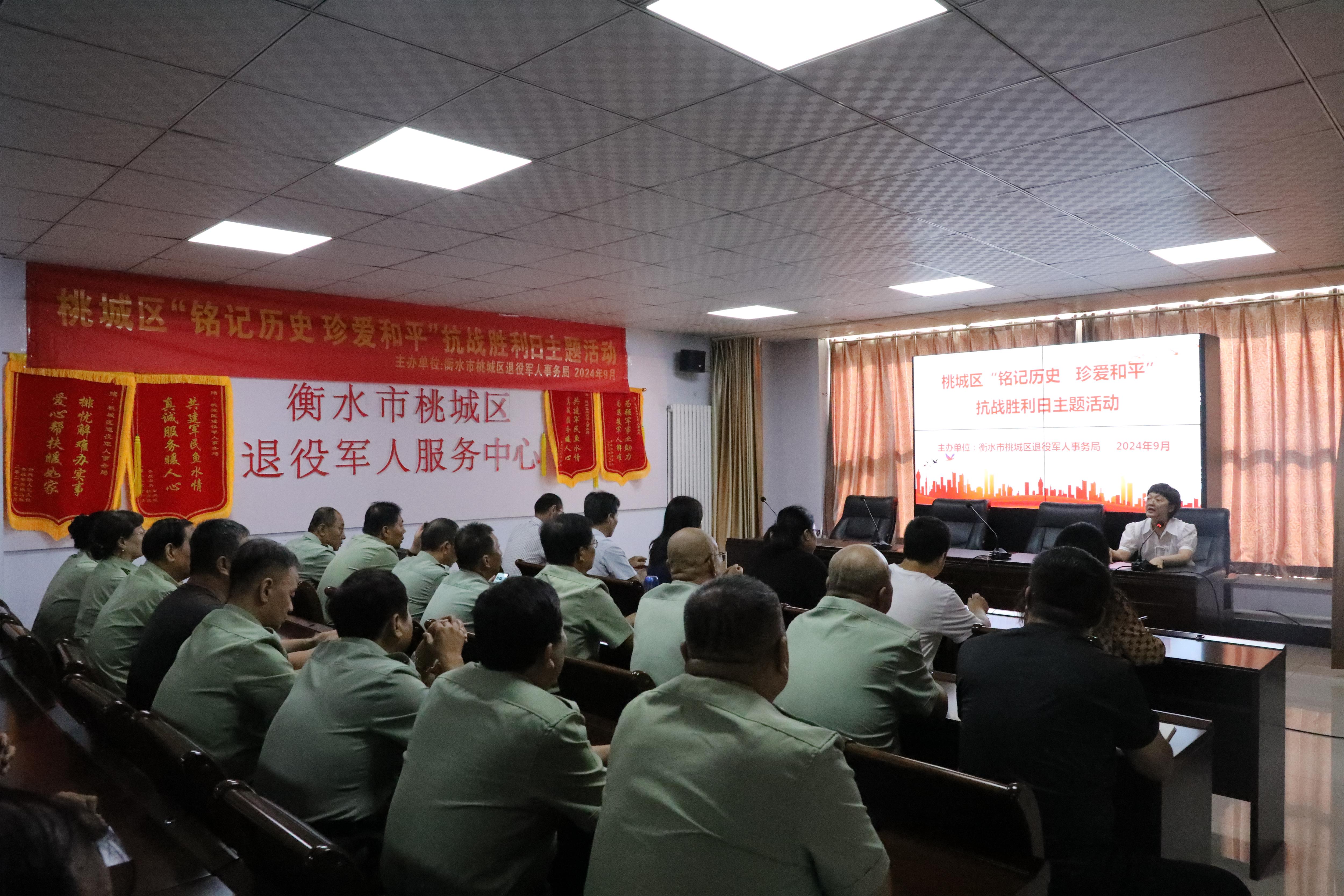 为纪念中国人民抗日战争胜利79周年,深切缅怀抗战英烈的光辉业绩,弘扬爱国主义精神,9月3日上午,桃城区退役军人事务局组织开展“铭记历史,珍爱和平”抗日战争胜利纪念日主题活动。区退役军人事务局全体干部职工和桃城区参战退役老兵共计40余人参加。