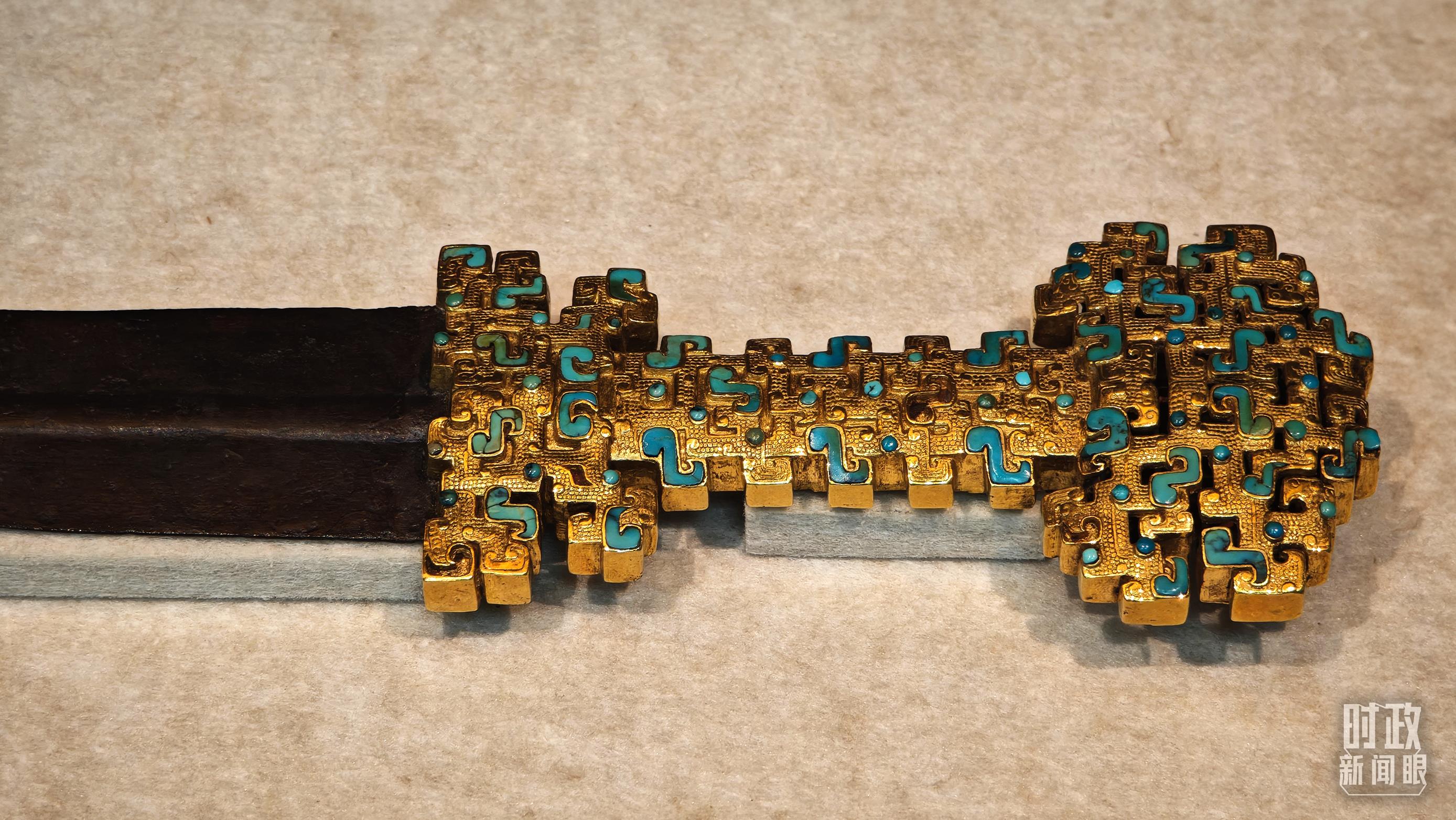 △这是1992年宝鸡市益门二号墓出土的金柄铁剑,剑柄嵌有绿松石。(总台央视记者彭汉明拍摄)