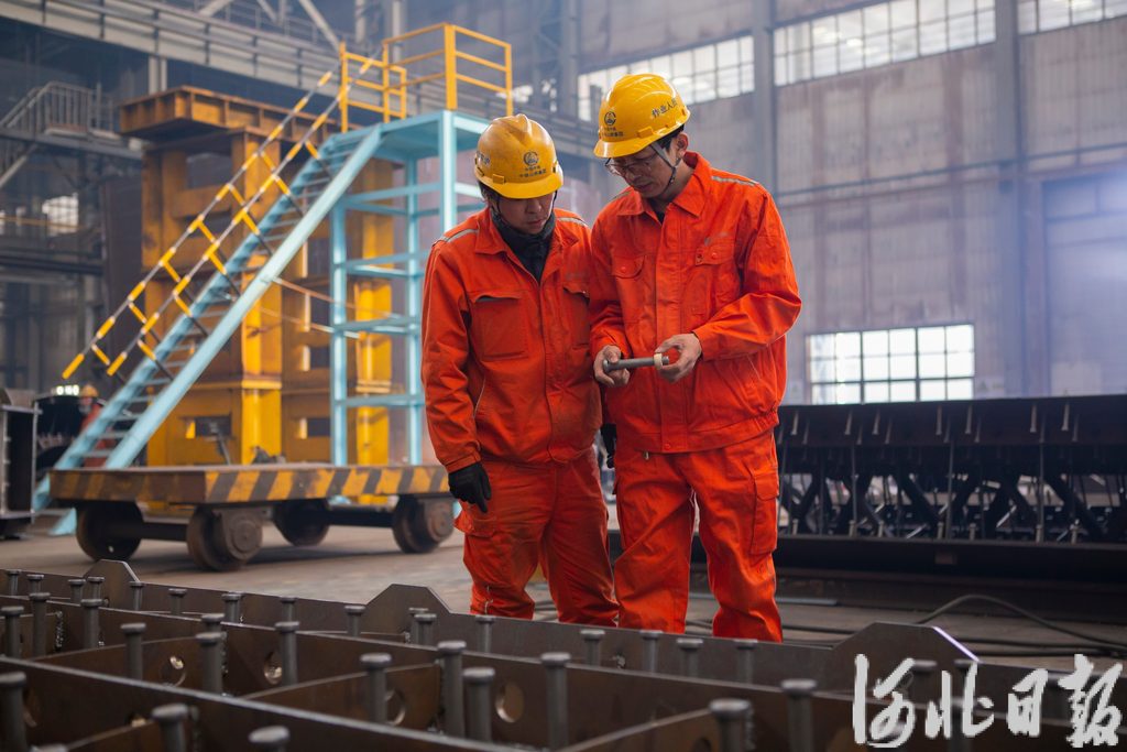近日,中铁山桥集团有限公司焊工特级技师张明(右)和工友正在对钢构件进行分析,为焊接做准备。河北日报通讯员董海岩摄