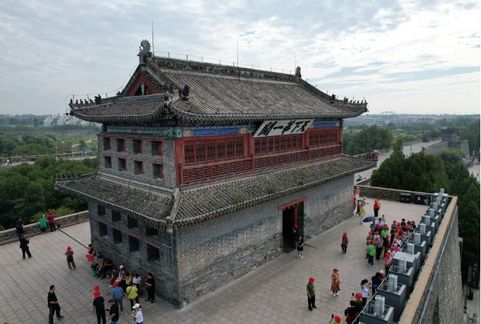 这是9月19日拍摄的“天下第一关”城楼。新华社记者 卢汉欣 摄9月19日,游客在秦皇岛市山海关区“天下第一关”景区游览(无人机照片)。新华社记者 杨世尧 摄