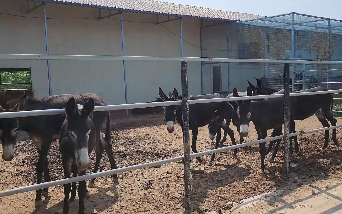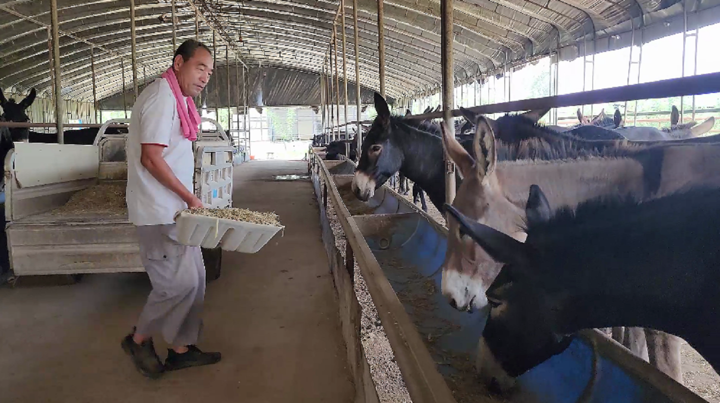 走进养殖基地,500余头膘肥体壮、毛发油亮的德州驴生活在这里,有的大口吃着“营养餐”、有的在悠闲地晒太阳、有的在地上放松打滚……可爱的小驴驹跟在母驴左右,憨态可掬,空气中弥漫着酸甜的味道。