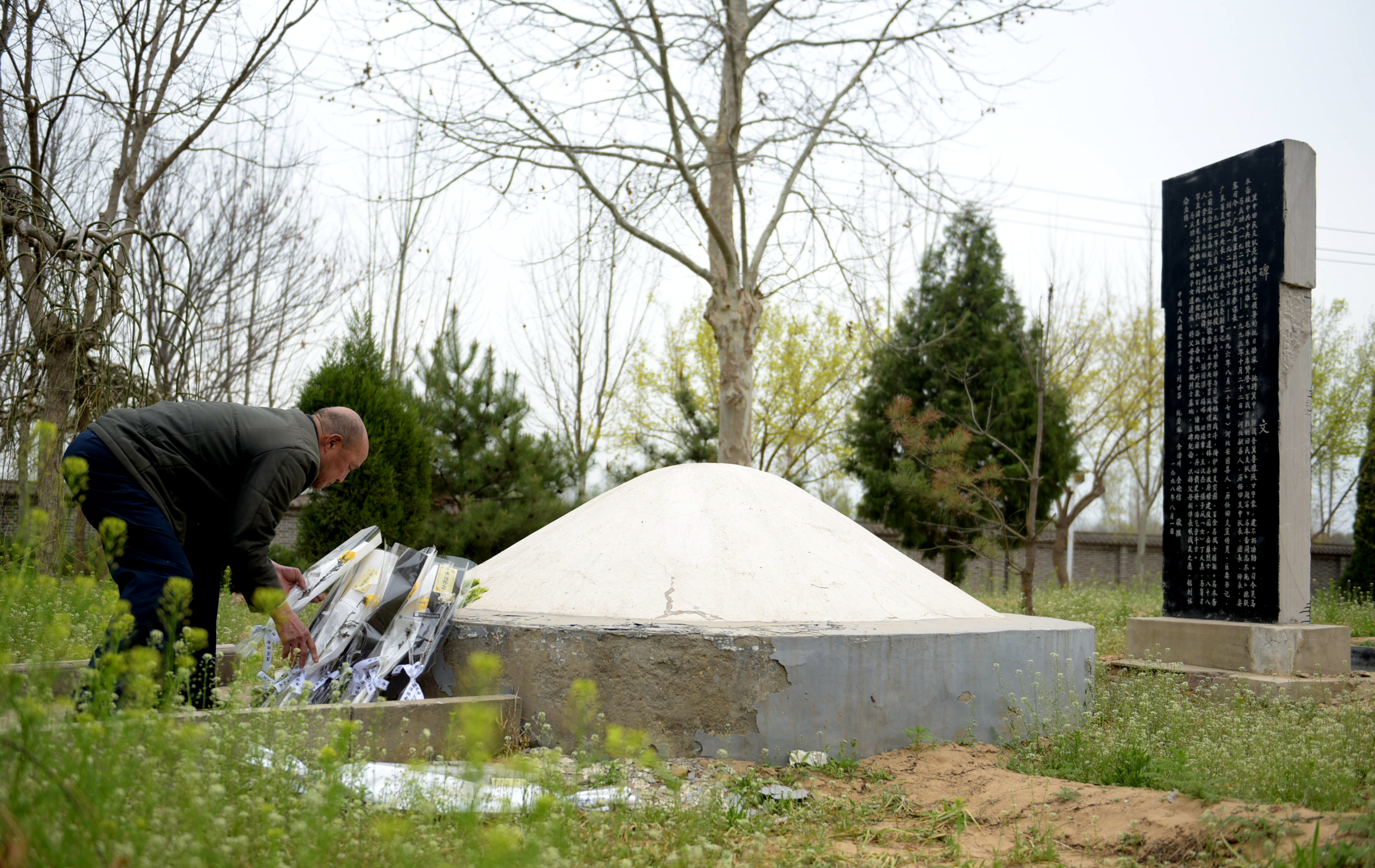 王志杰在整理烈士墓碑前的鲜花。 崔贤飞 摄