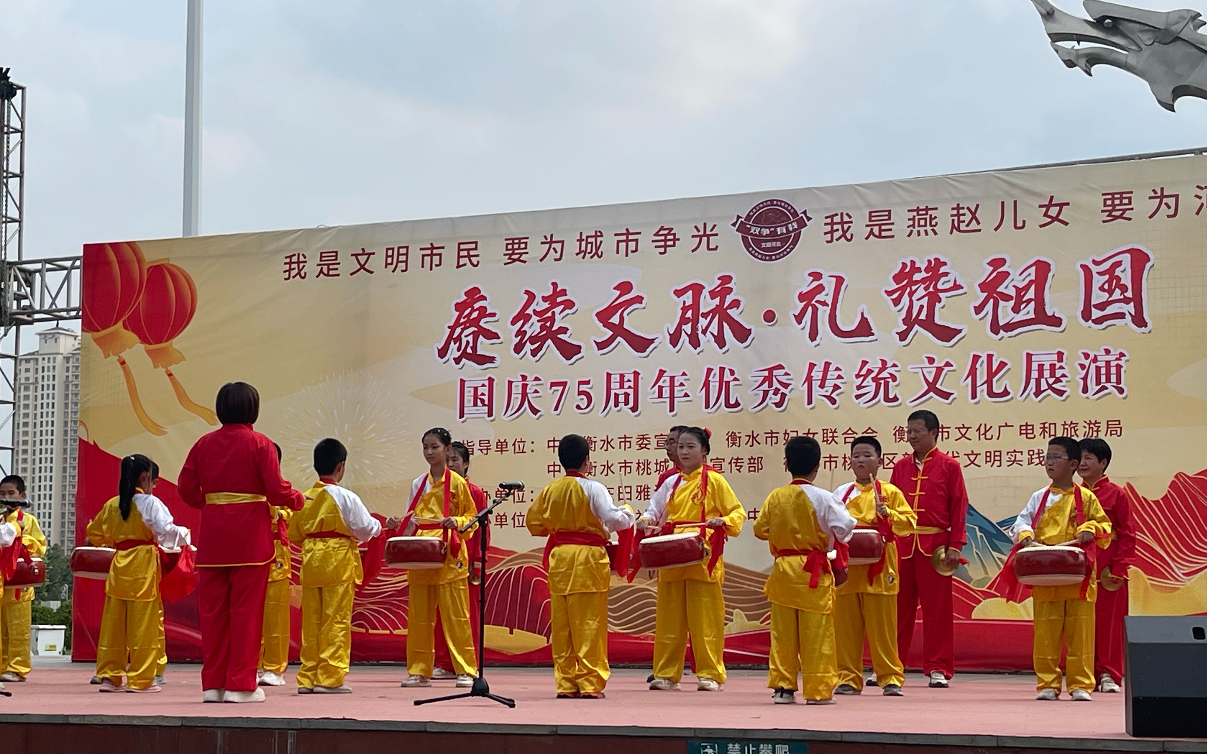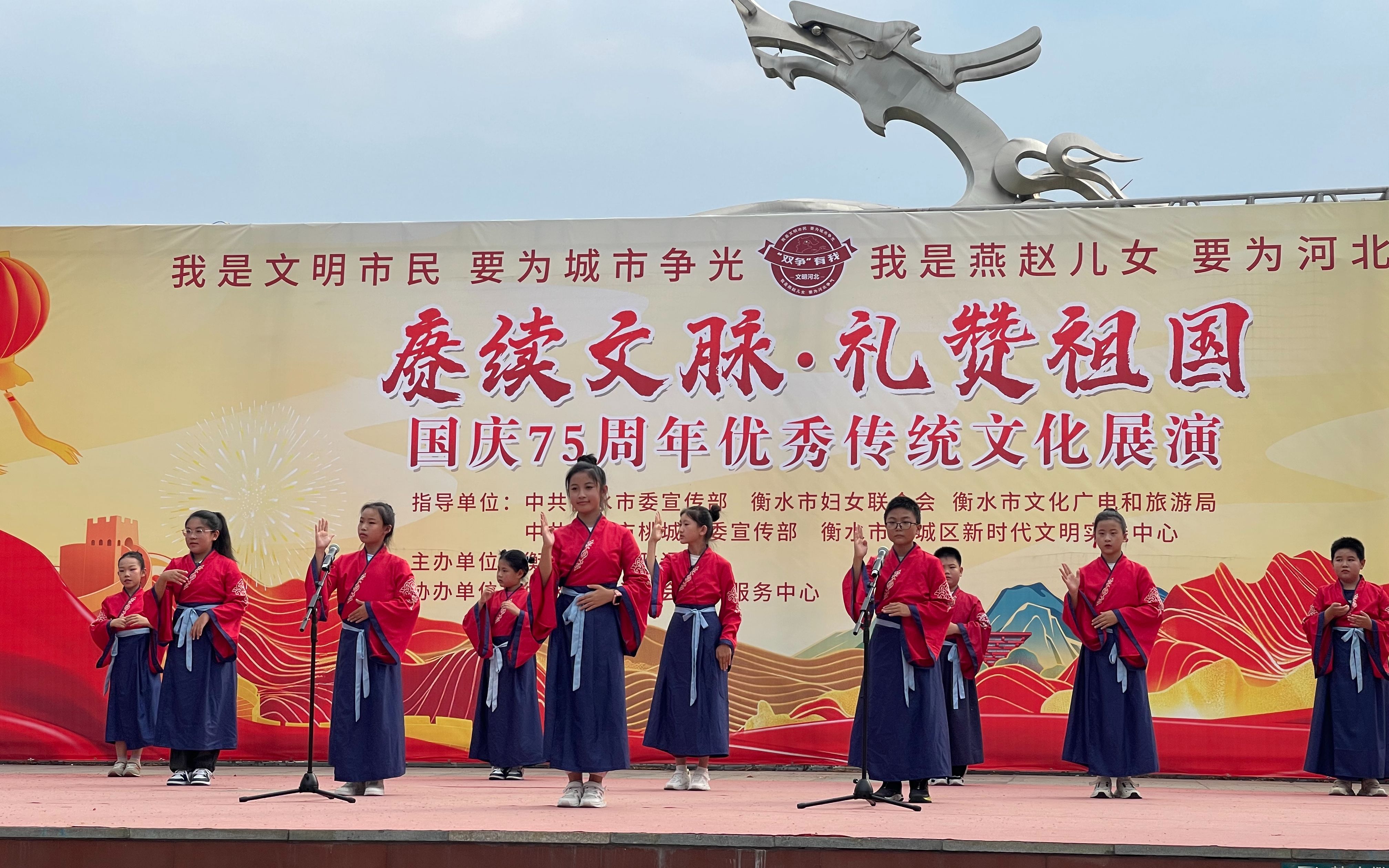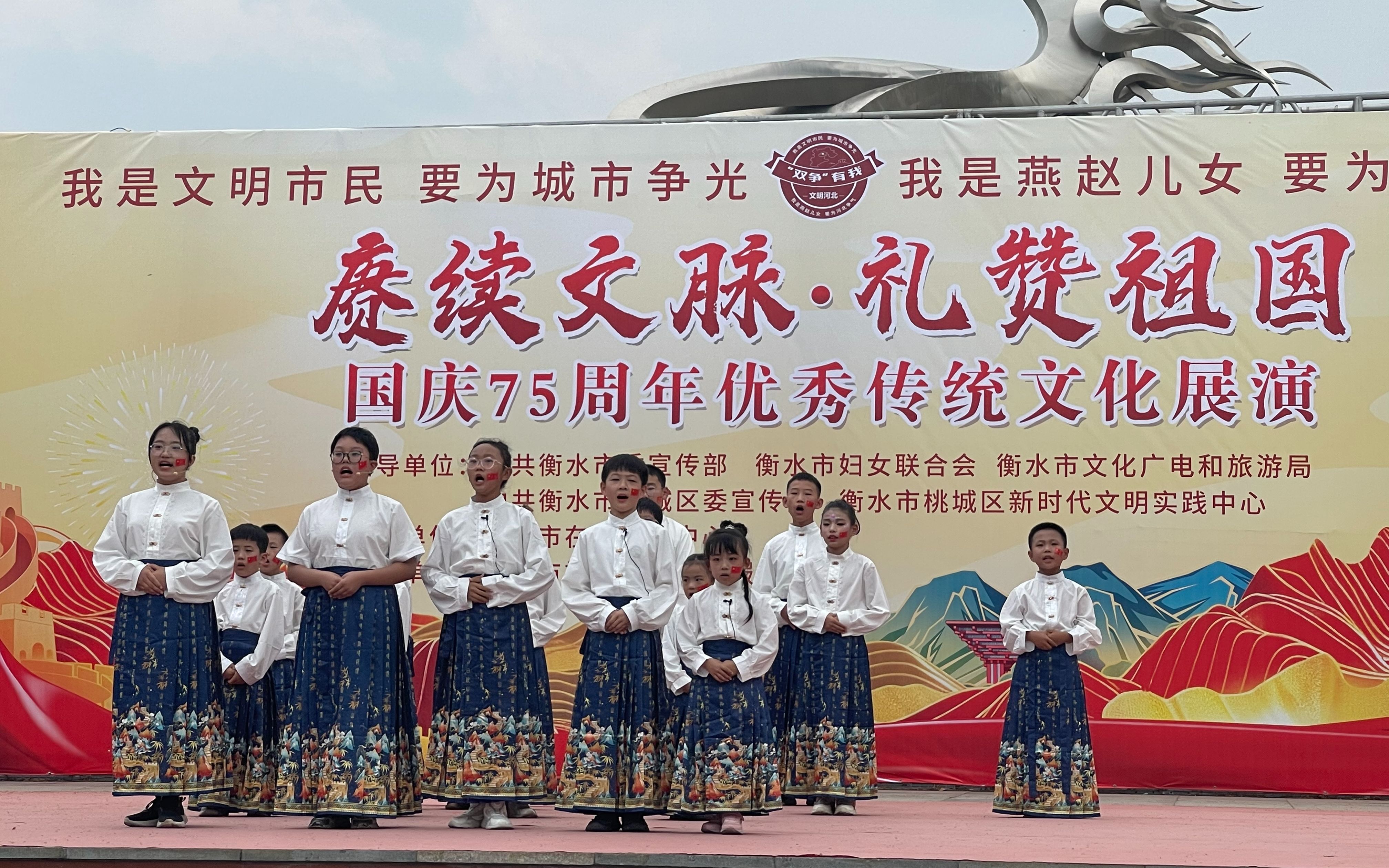 9月28日,“赓续文脉 礼赞祖国——桃城区庆国庆优秀传统文化展演”活动在市区九州广场上演。150余名学生通过诗词吟诵、歌舞表演等形式,展示中华传统优秀文化的风采,为广大市民献上了一场精彩的传统文化盛宴。