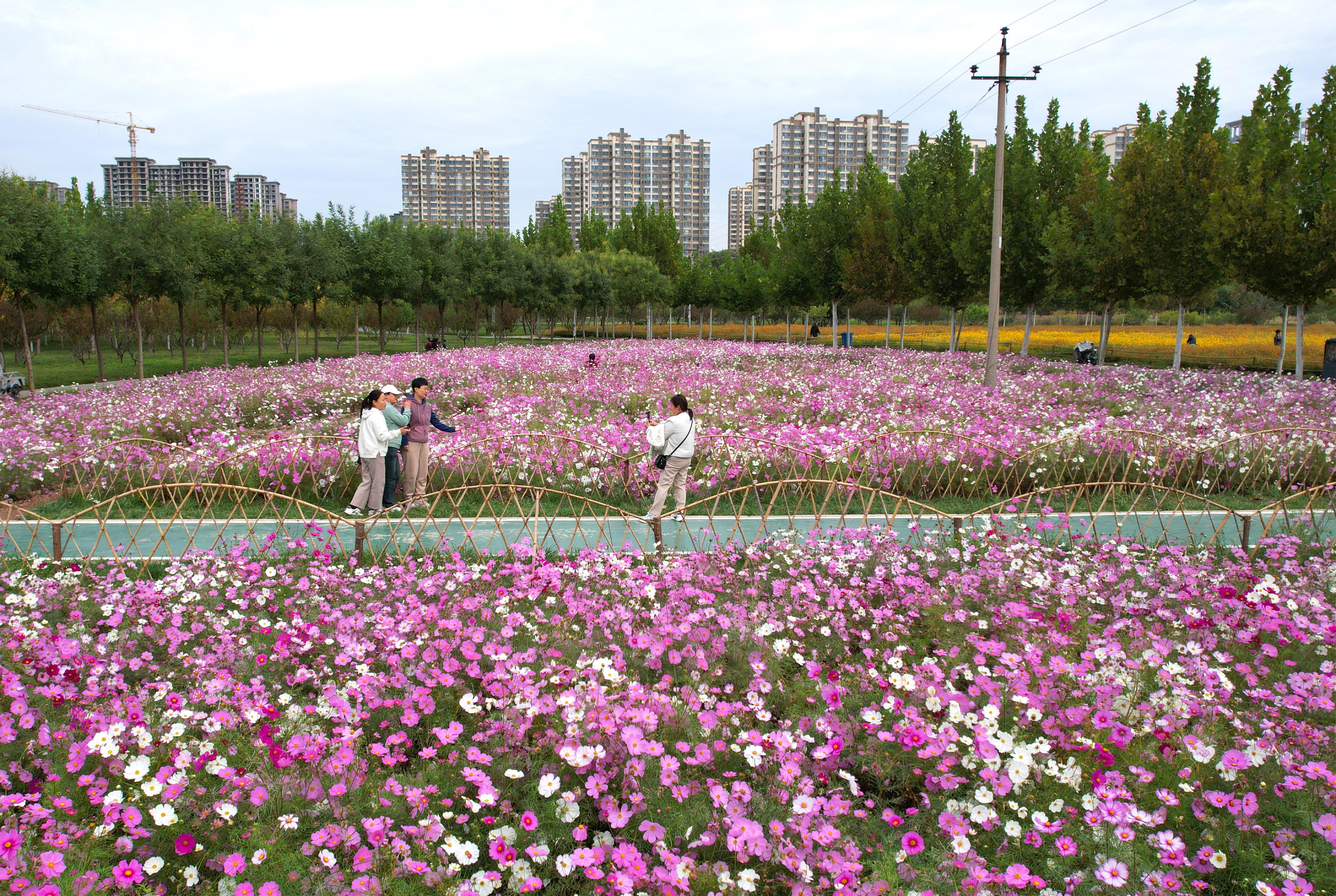 前来赏花的游客络绎不绝,大家徜徉在花海中,纷纷拿出手机、相机拍照,用镜头记录浪漫的秋景。摄影爱好者靳女士来公园拍照,看到这片格桑花,不禁感叹成片的花海着实太美太震撼了,“俯瞰这片格桑花,绚丽缤纷,像是给大地穿上了一条多彩的碎花裙,朵朵迷人,让人流连忘返。”