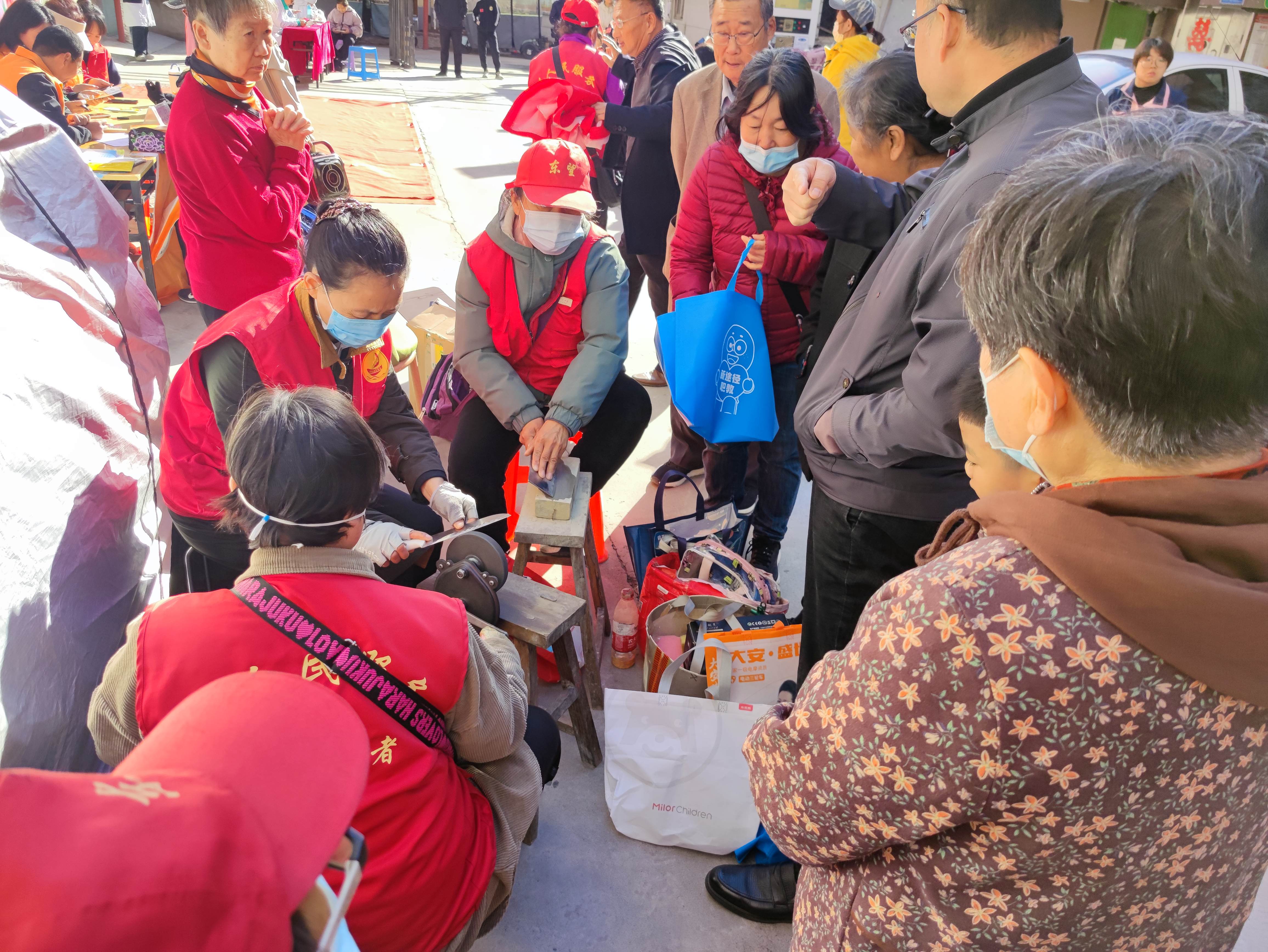 台上歌舞不断,台下热闹非凡。在现场周边,志愿服务队面向居民同步开展了便民服务,志愿者们为年满60周岁老人发放黄手环并免费理发,为居民们提供义诊服务以及磨剪子、菜刀等便民服务。