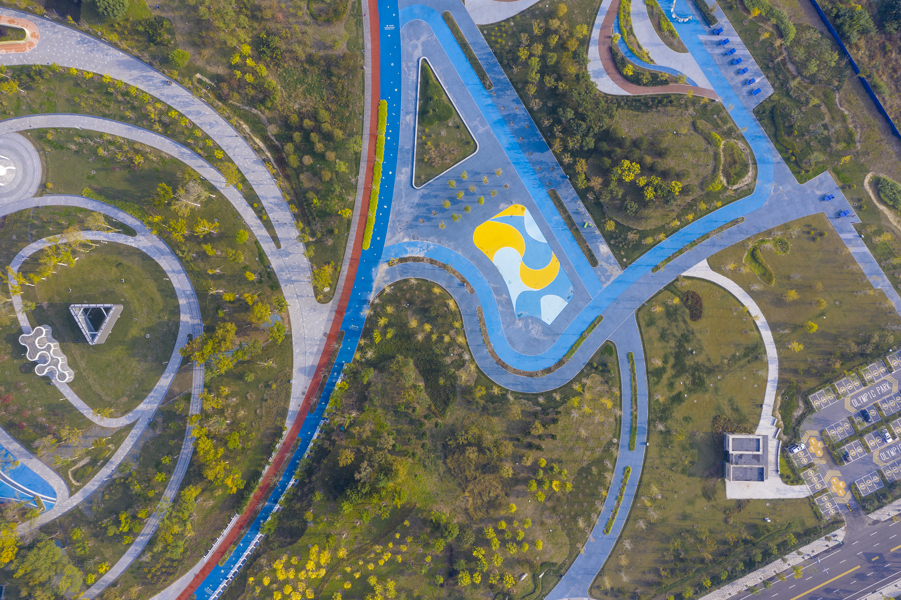 奥体公园规划设计以“奥体祥云”为设计理念,与紧邻的滏阳河、吴公渠、奥体中心相融合,形成“水畔祥云”的空间意象。整体工程包括园林建筑及小品、绿化种植、园路铺装、照明系统、灌溉系统、室外装饰、导览系统等建设内容。公园植物配置在充分保留原有乔木的基础上,种植彩叶植物、常绿植物及地被花卉,打造出了玉兰大道、林下花街、藤本花廊、雨水花园等植物景观,营造出四季鲜明的景观特色。无论春日郁金香的颜色缤纷,还是夏日月季的热烈浪漫,更或是秋日硫华菊的浓艳夺目,都让市民在移步换景之间尽情感受自然的美丽风采。