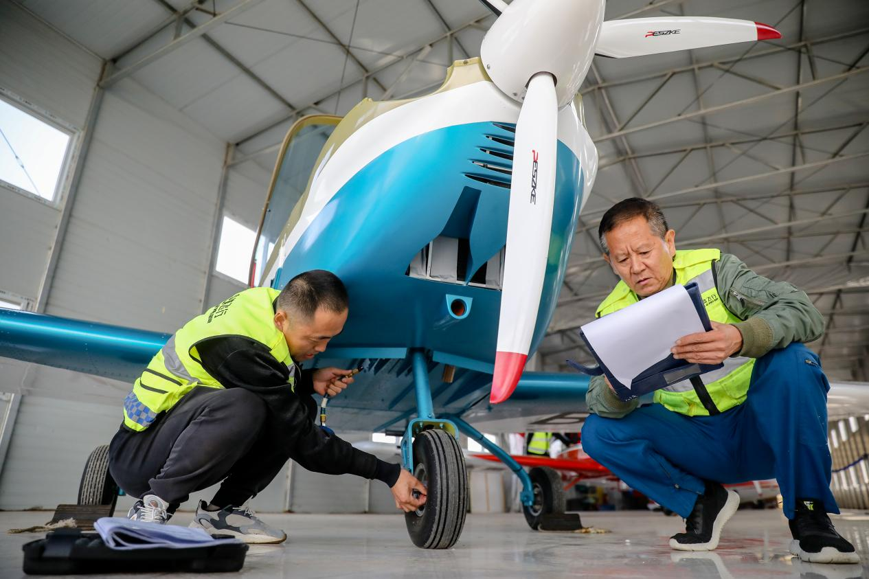 检查飞机外观、轮胎胎压、发动机启停……首飞前,享飞就飞衡水通用航空有限公司工作人员为飞机做了各项测试和准备。飞行过程中,地面执勤人员、塔台、试飞员,保持高度紧张的工作状态,确保首飞平稳安全。