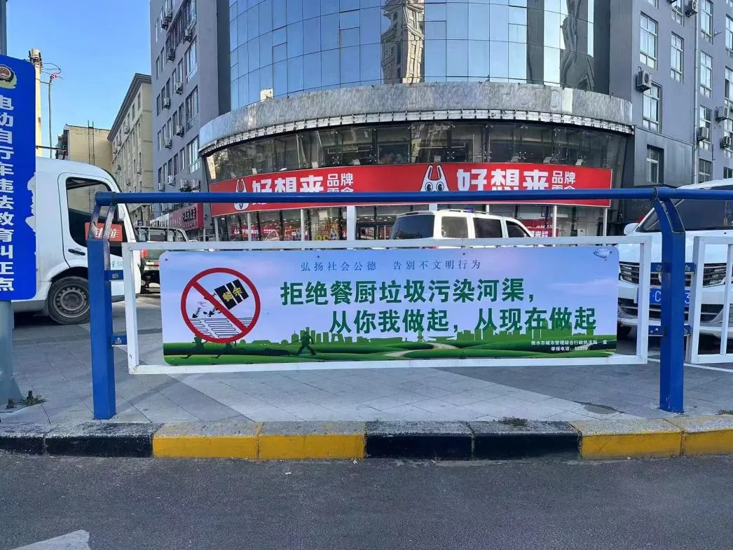 市排水管理中心在市区胜利路育才大街口、中华大街新华路口、中心大街招贤路口等餐饮密集区的便道护栏上设计安装了一批公益宣传广告牌,以餐厨垃圾治理为主要内容,美观大方、简洁明了,积极引导广大商户、市民关注并爱护城市水环境,自觉规范处置厨余废弃物。