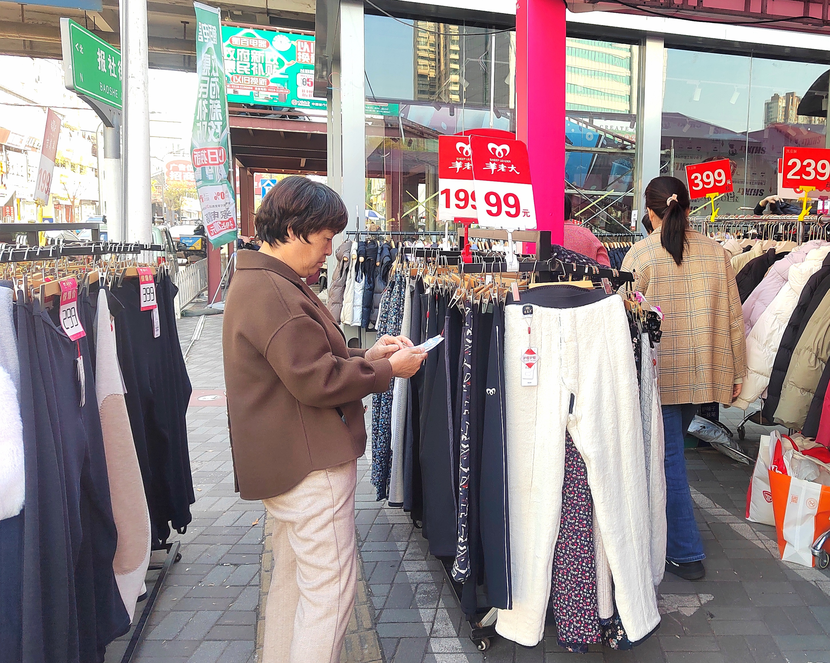 呢子大衣、羽绒服、羊毛衫……走进各大商超的服装区,放眼望去,满满的都是厚厚的冬装。11月6日,在人民路一家商场外的广场上摆满了棉鞋、羽绒服等促销商品,吸引了不少顾客驻足选购。市民陈女士提着一件刚刚挑选的轻薄羽绒服说:“这两天气温下降了不少,这不,今天正好路过这里,就给孩子买了一件羽绒服。”走进商场,在一女装专柜看到,厅堂内满满都是冬装,销售人员正忙着给顾客介绍衣服的款式、价格。这位销售人员介绍,前段时间天气比较暖和,还有部分顾客买秋装,但随着这两天气温下降,买羽绒服和羊绒大衣的人就多了起来。