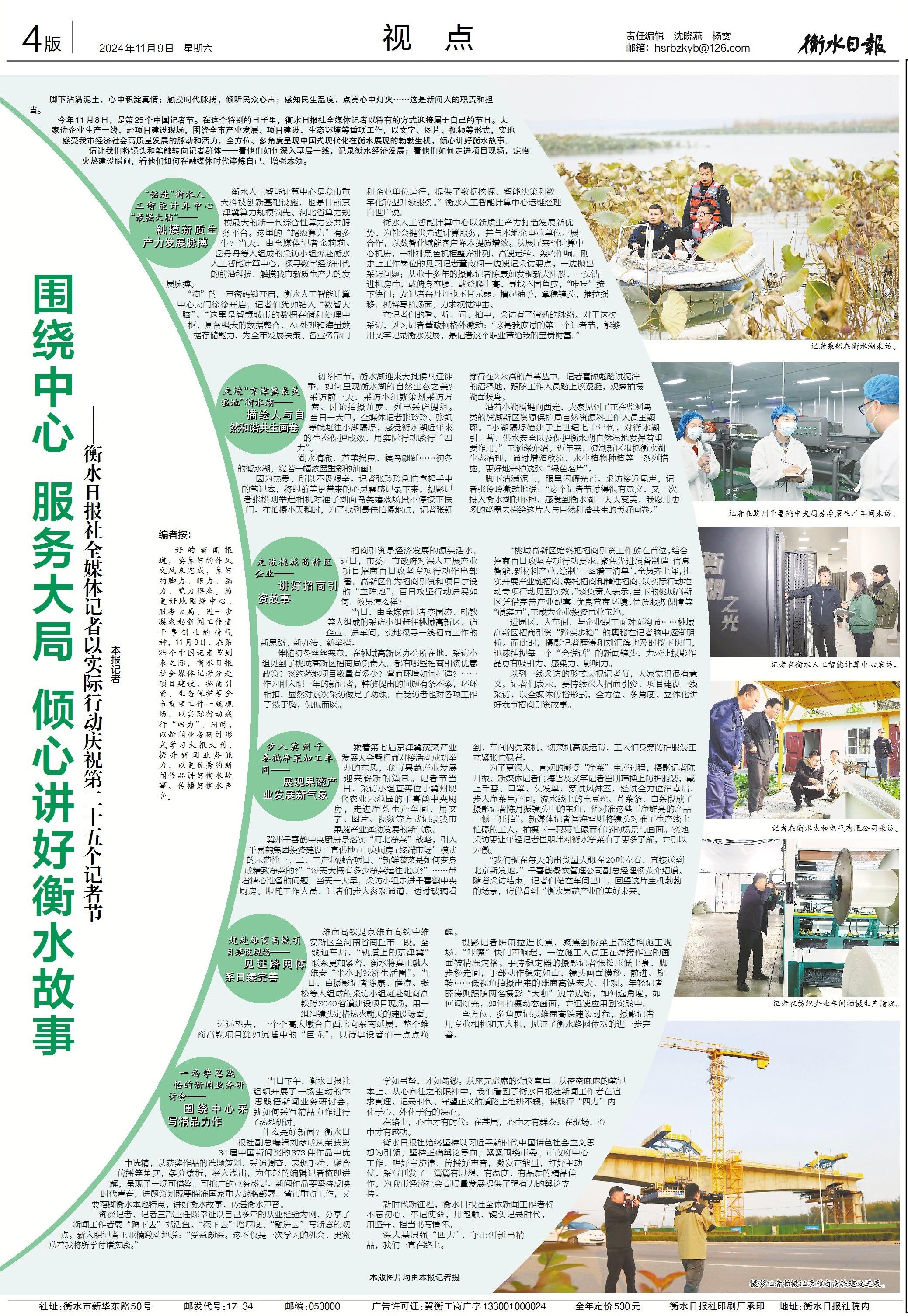 今年11月8日,是第25个中国记者节。在这个特别的日子里,衡水日报社全媒体记者以特有的方式迎接属于自己的节日。大家进企业生产一线、赴项目建设现场,围绕全市产业发展、项目建设、生态环境等重项工作,以文字、图片、视频等形式,实地感受我市经济社会高质量发展的脉动和活力,全方位、多角度呈现中国式现代化在衡水展现的勃勃生机,倾心讲好衡水故事。