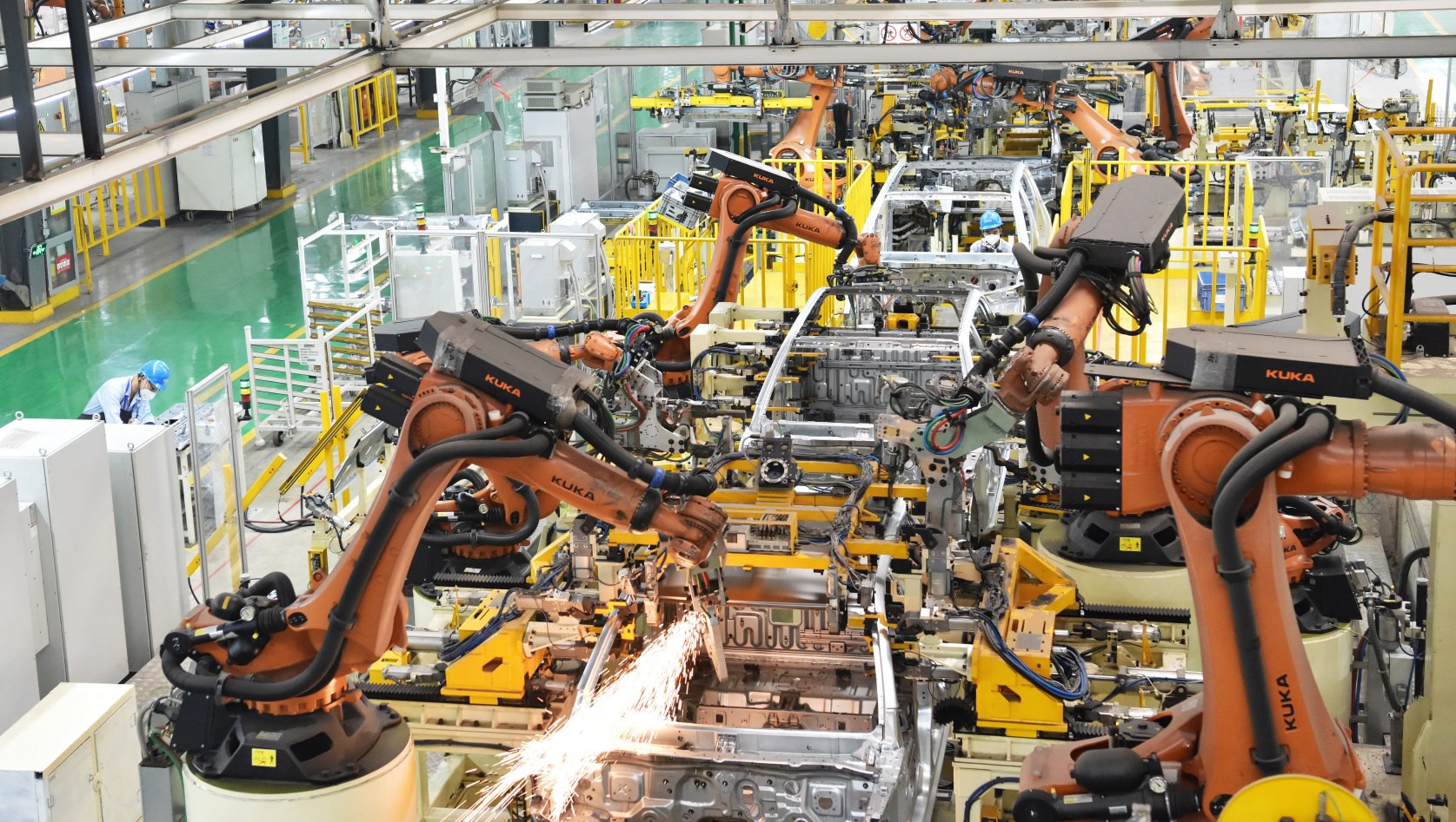 河北长安汽车有限公司总装二车间一派繁忙景象,机械臂不停舞动,线上正在生产的是全球首款增程式皮卡车。