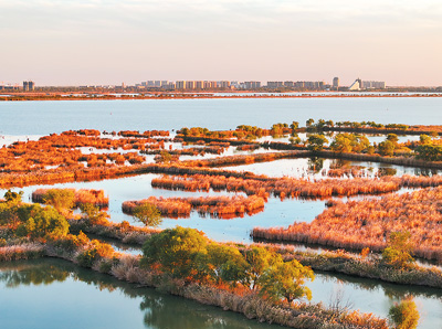 梅花岛芦苇荡前,鸟儿在成群嬉戏。